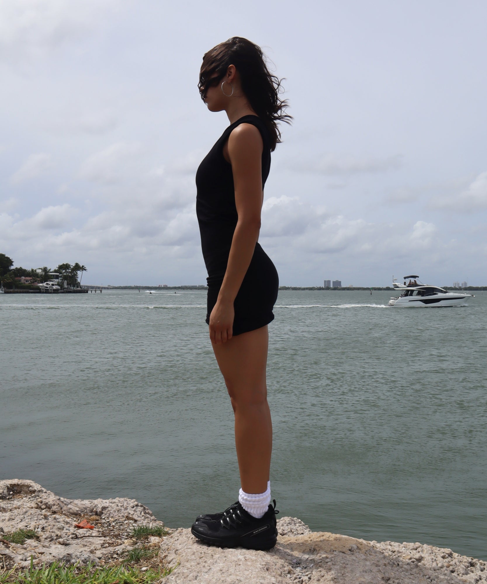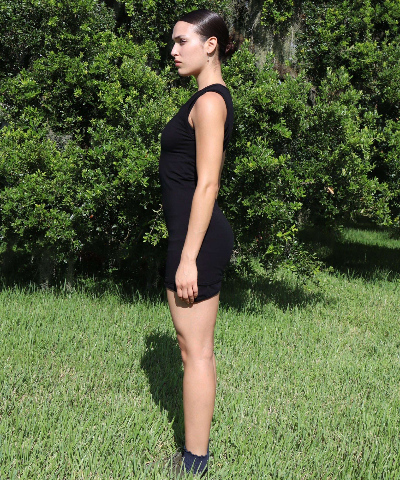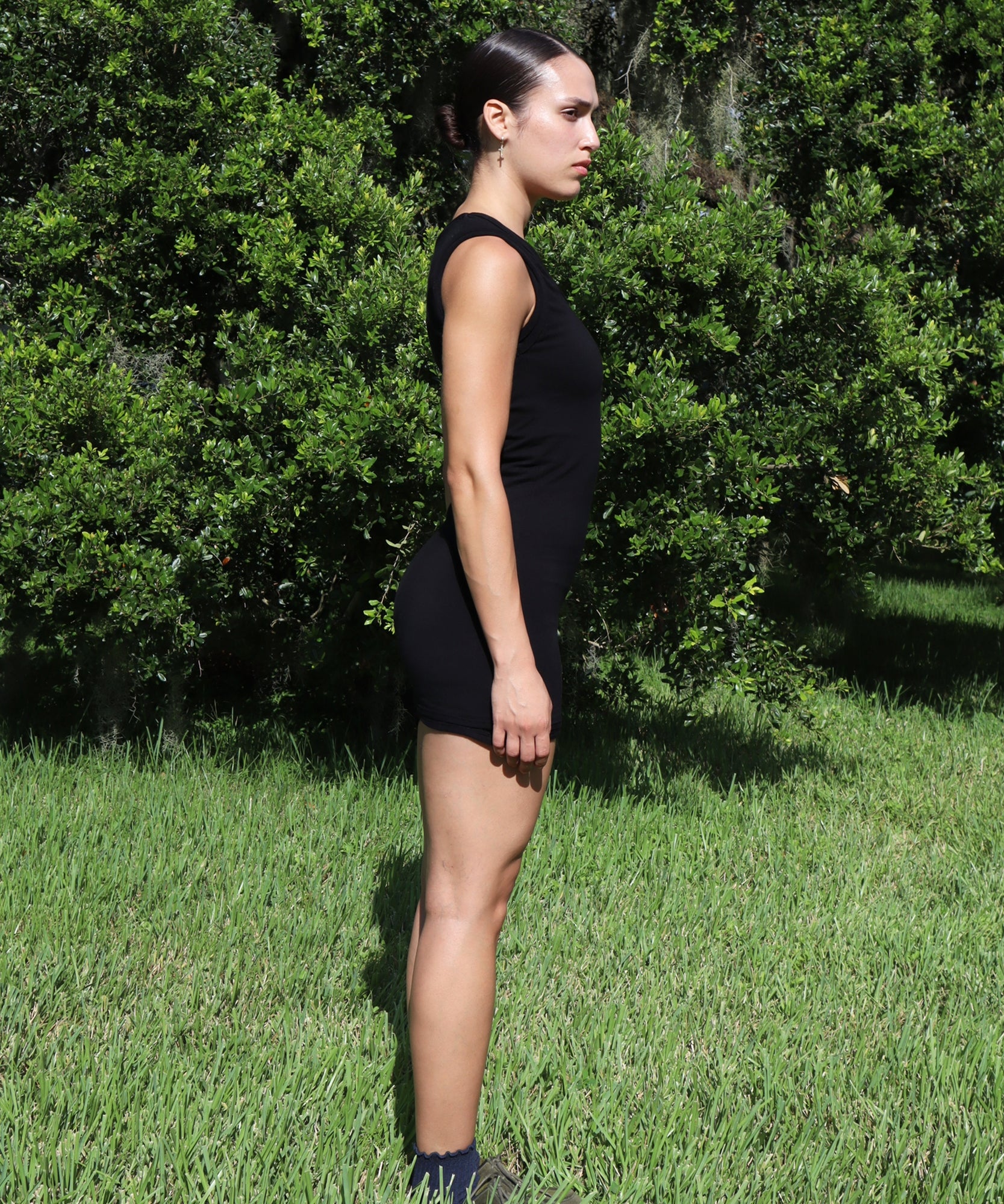 this sporty mini dress is made by sewing two layers of thick soft stretch cotton on top of each other. bottom layer is kept slightly longer and asymmetrical to exaggerate the layered look.