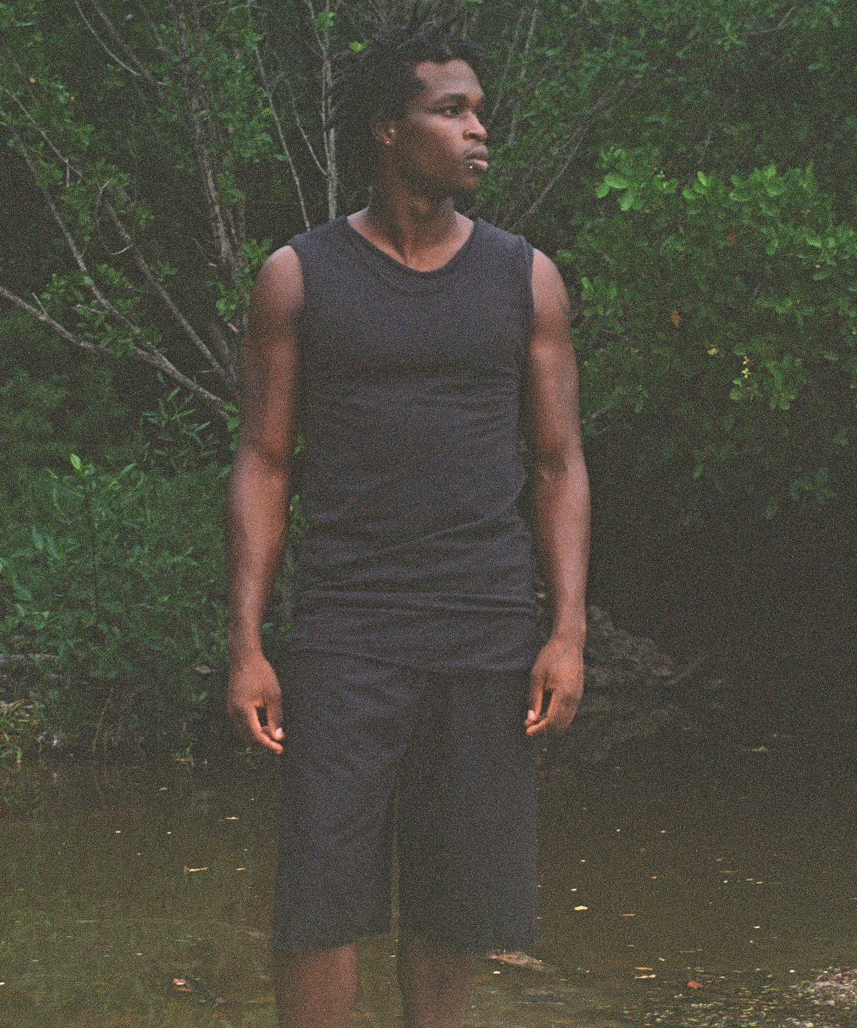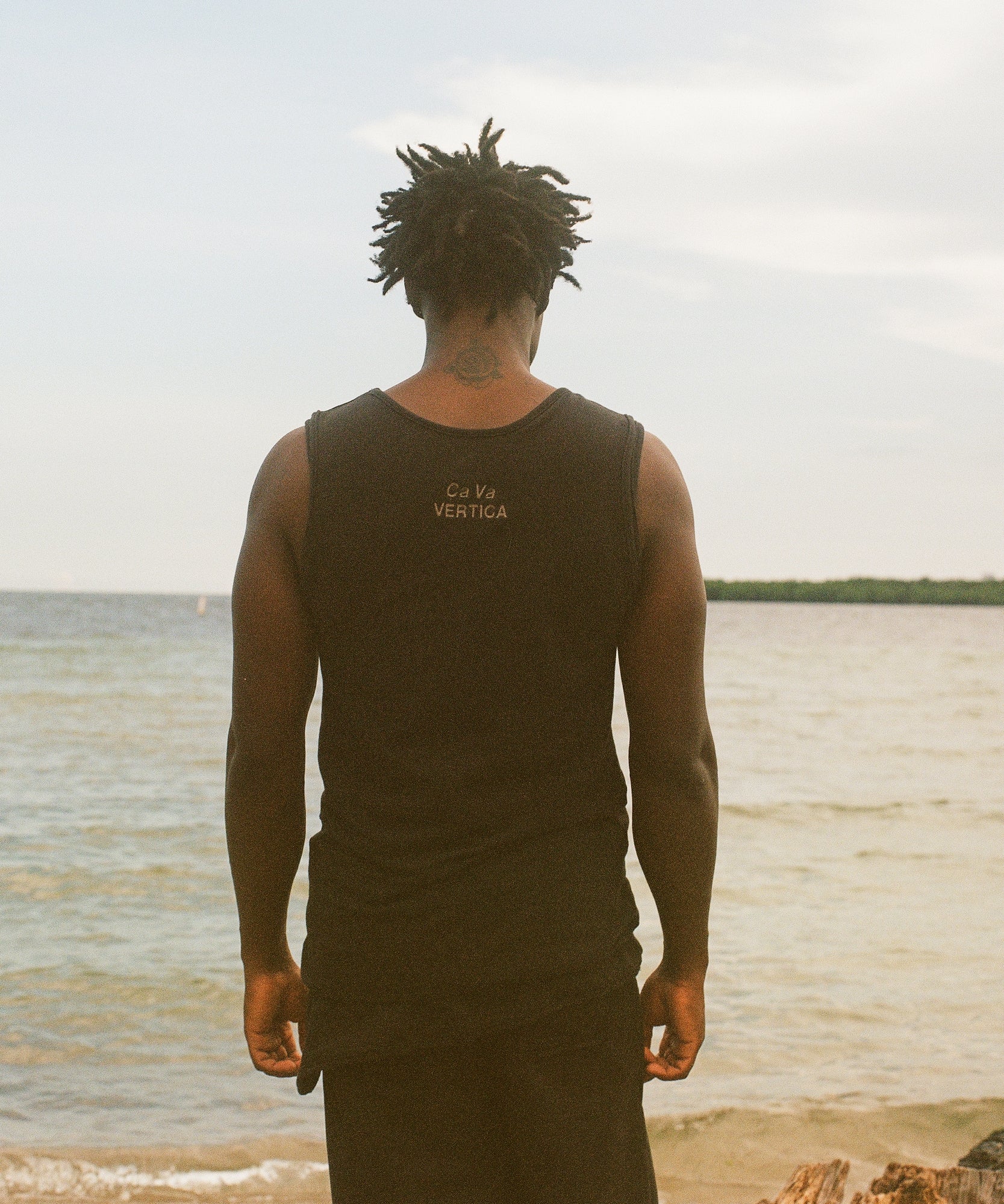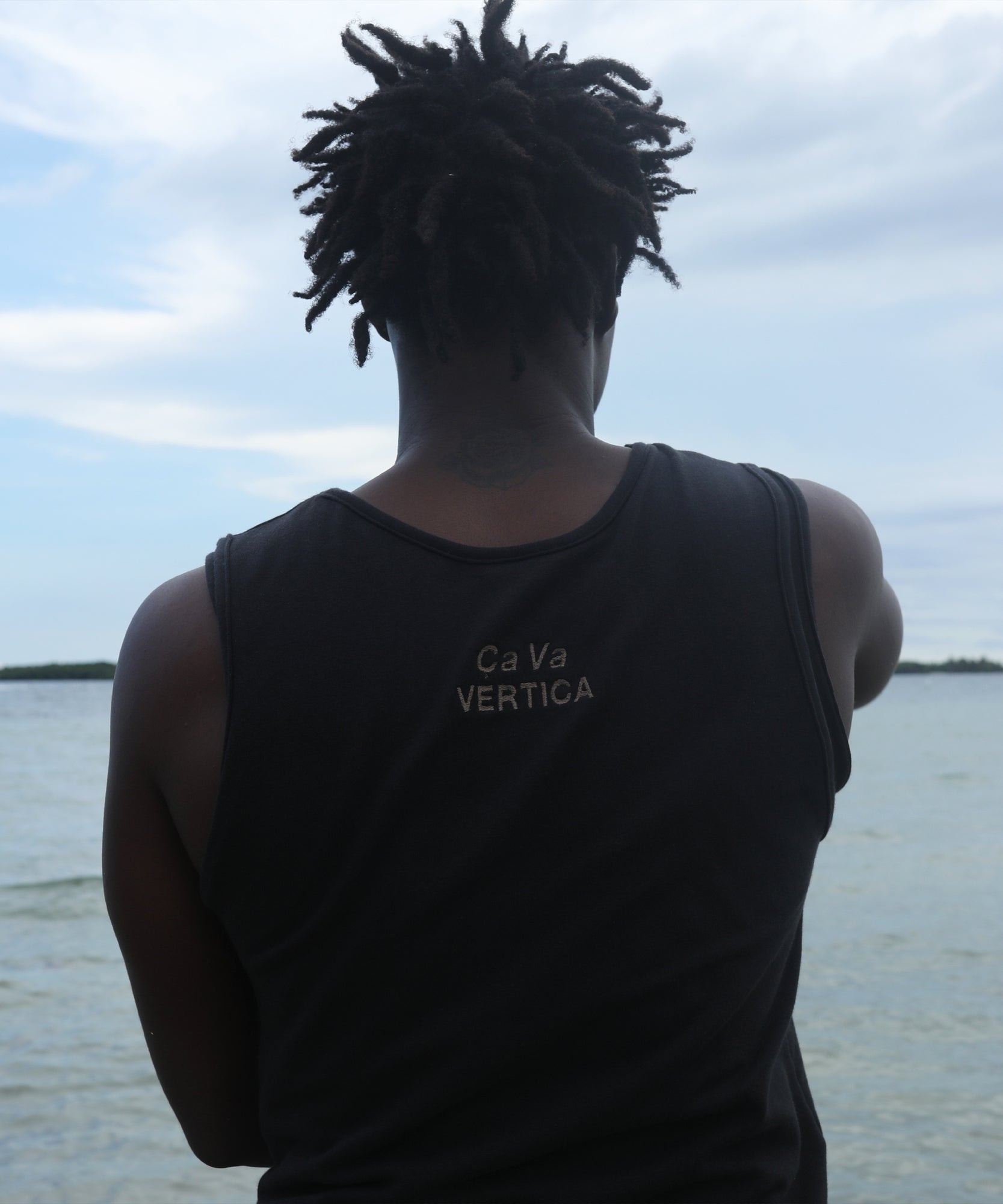 this tank is made by sewing two layers of thick and stretchy cotton on top of each other. bottom layer is kept slightly longer and asymmetrical to exaggerate the layered look.