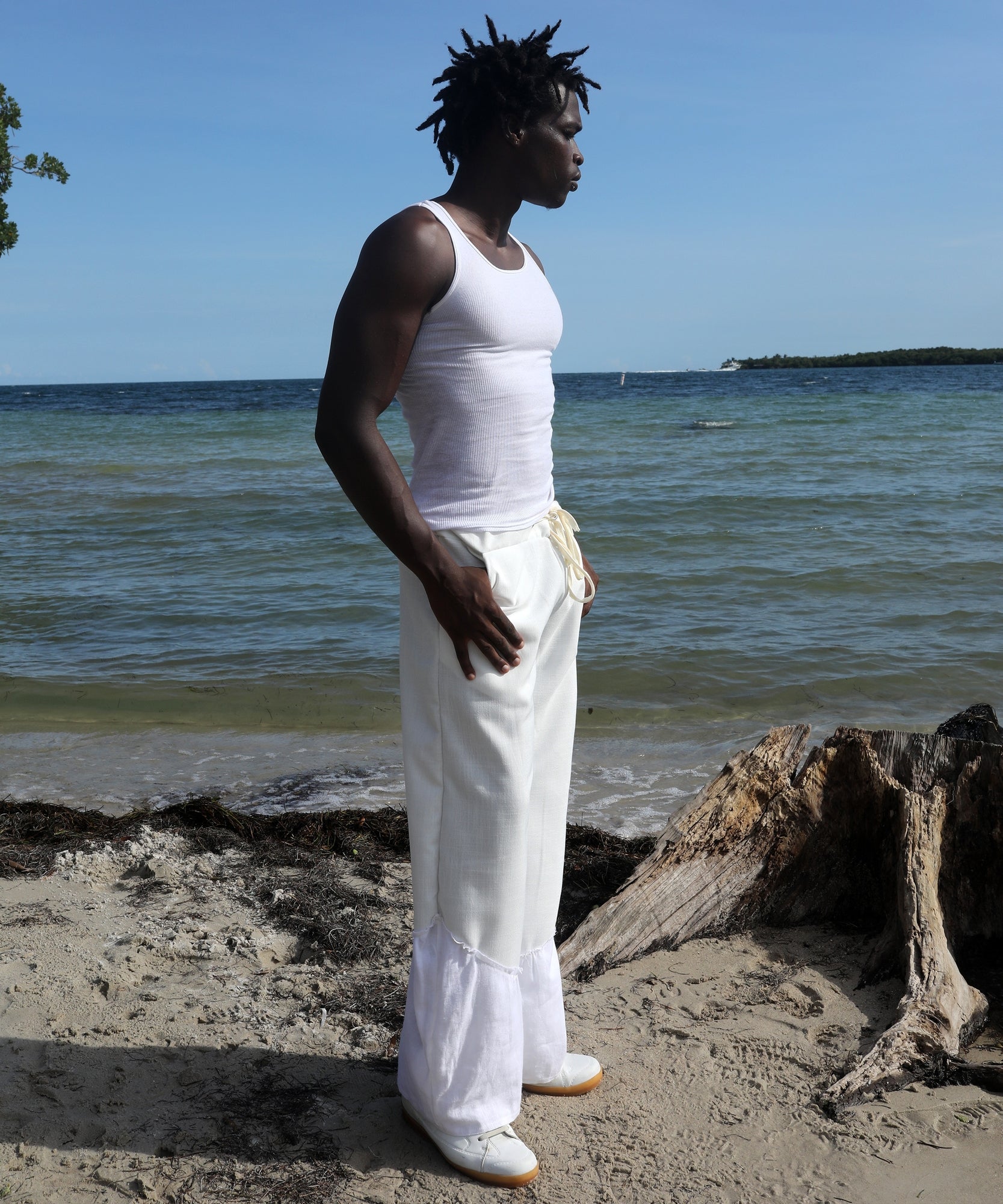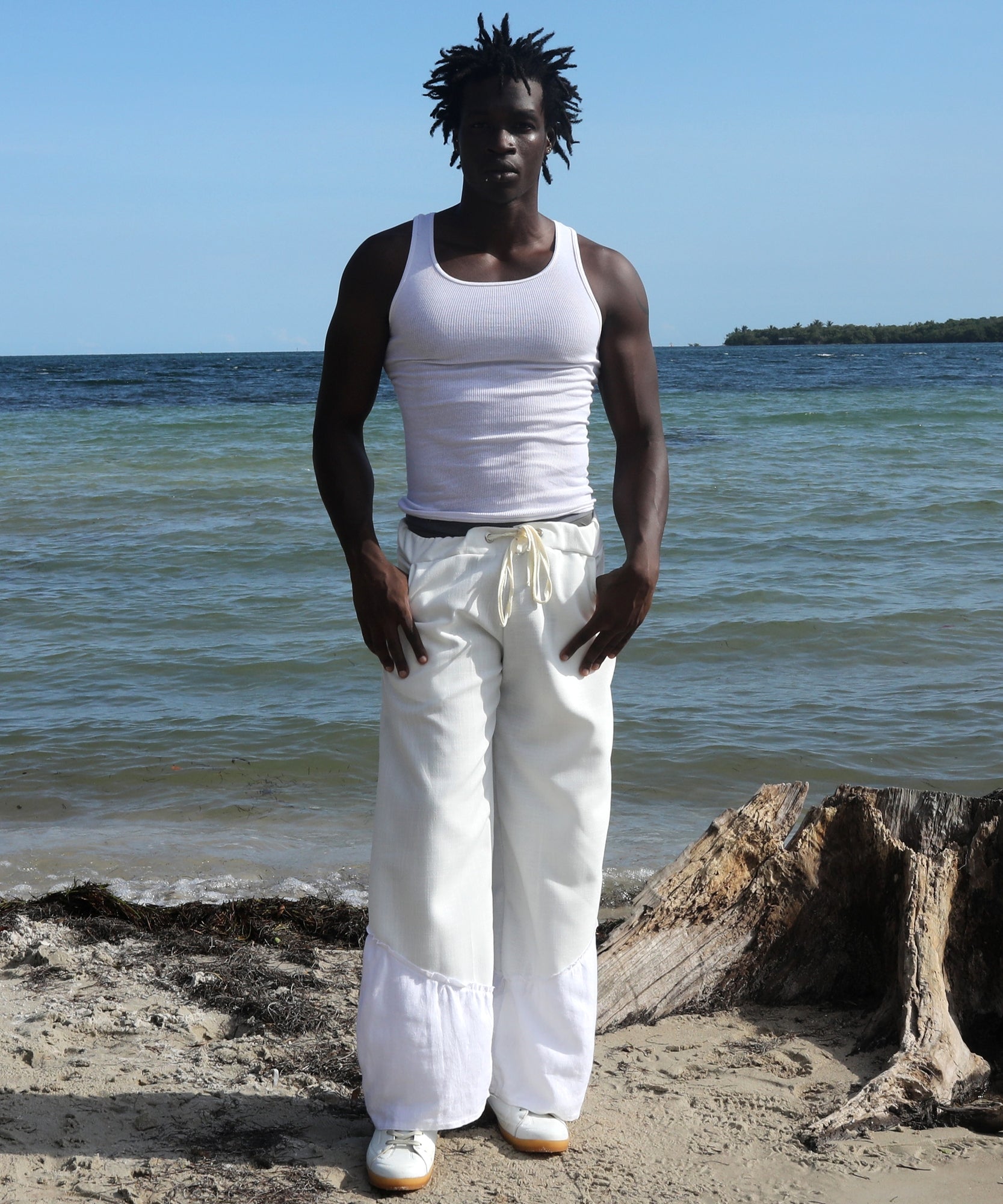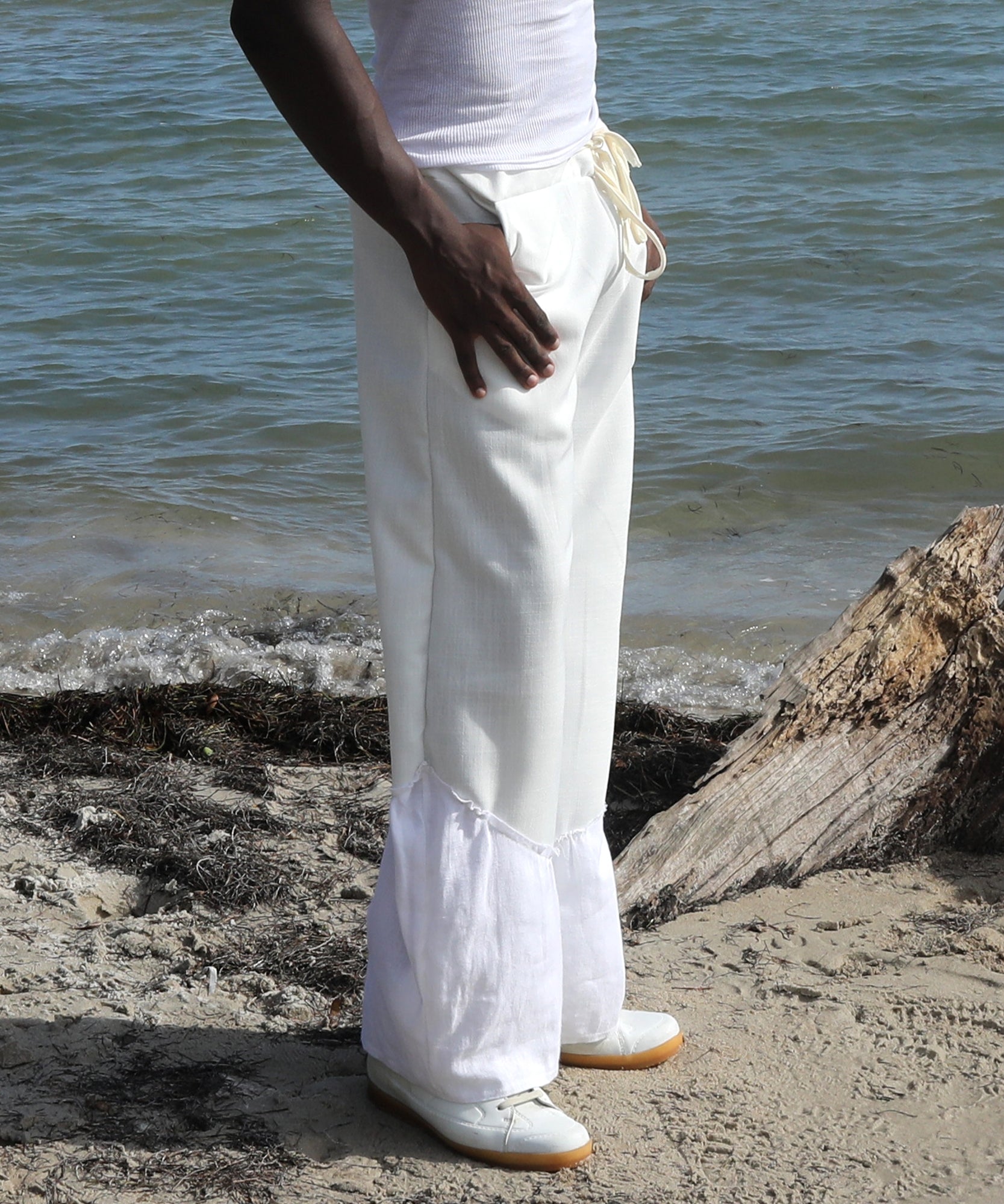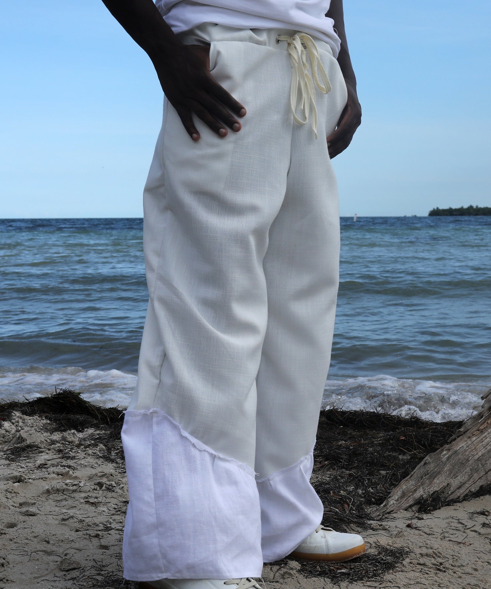 the base of these pants are made with a heavy weight linen fabric that is breathable and soft to the touch. panel detailing on the bottom of legs creates texture by introducing a lighter weight white linen. drawstring waistband allows you to adjust the fit to your liking.