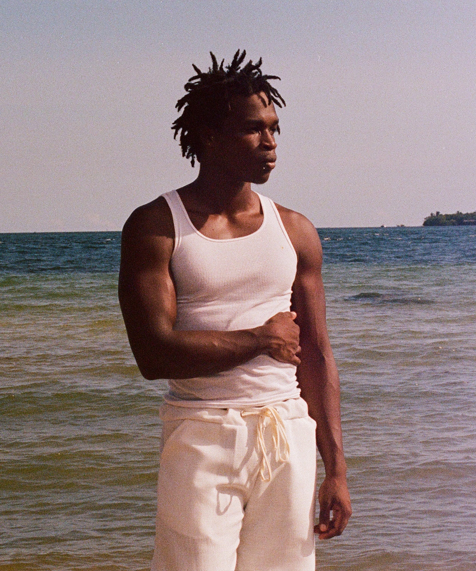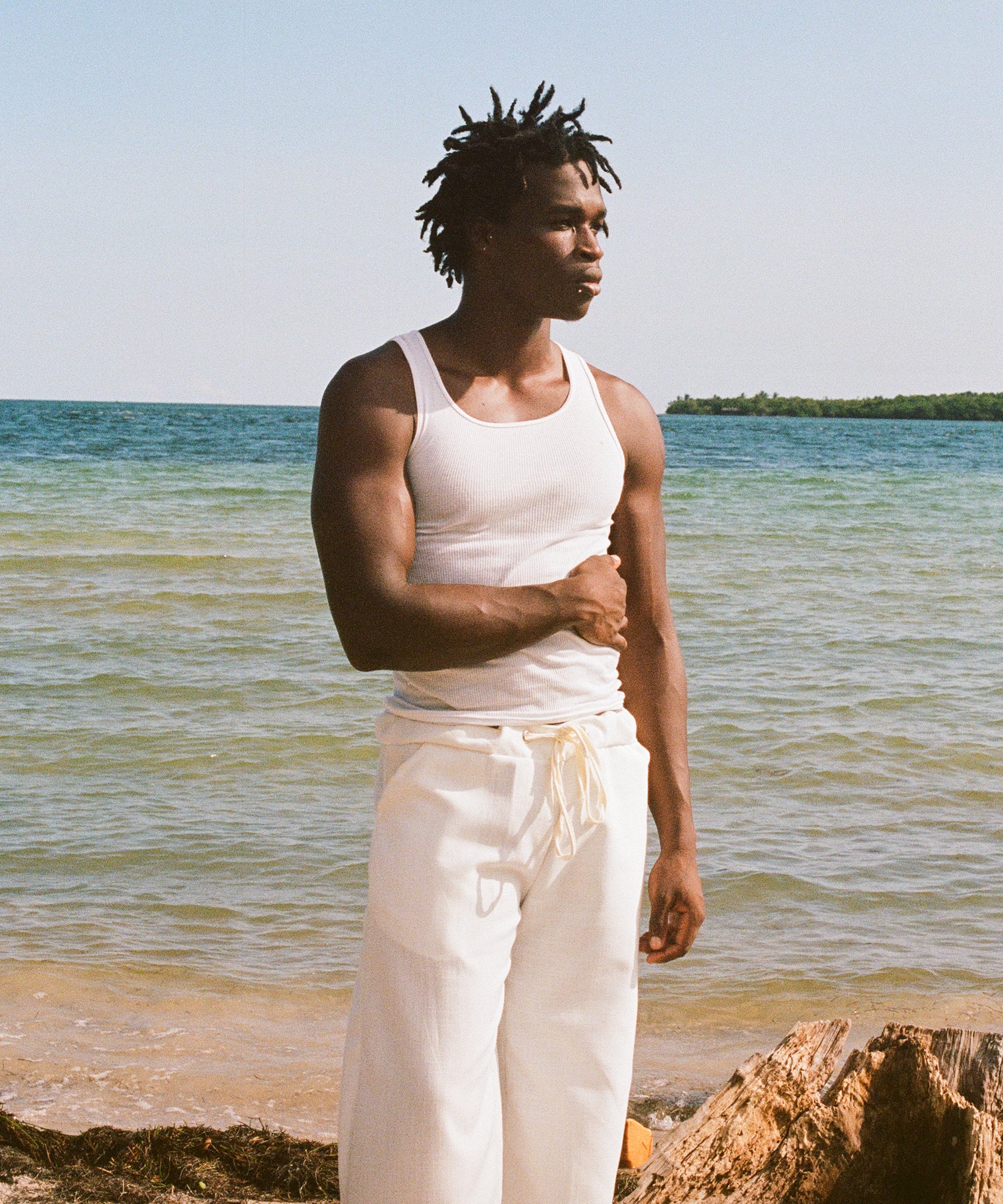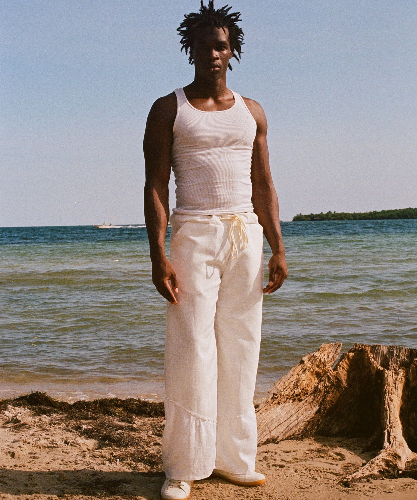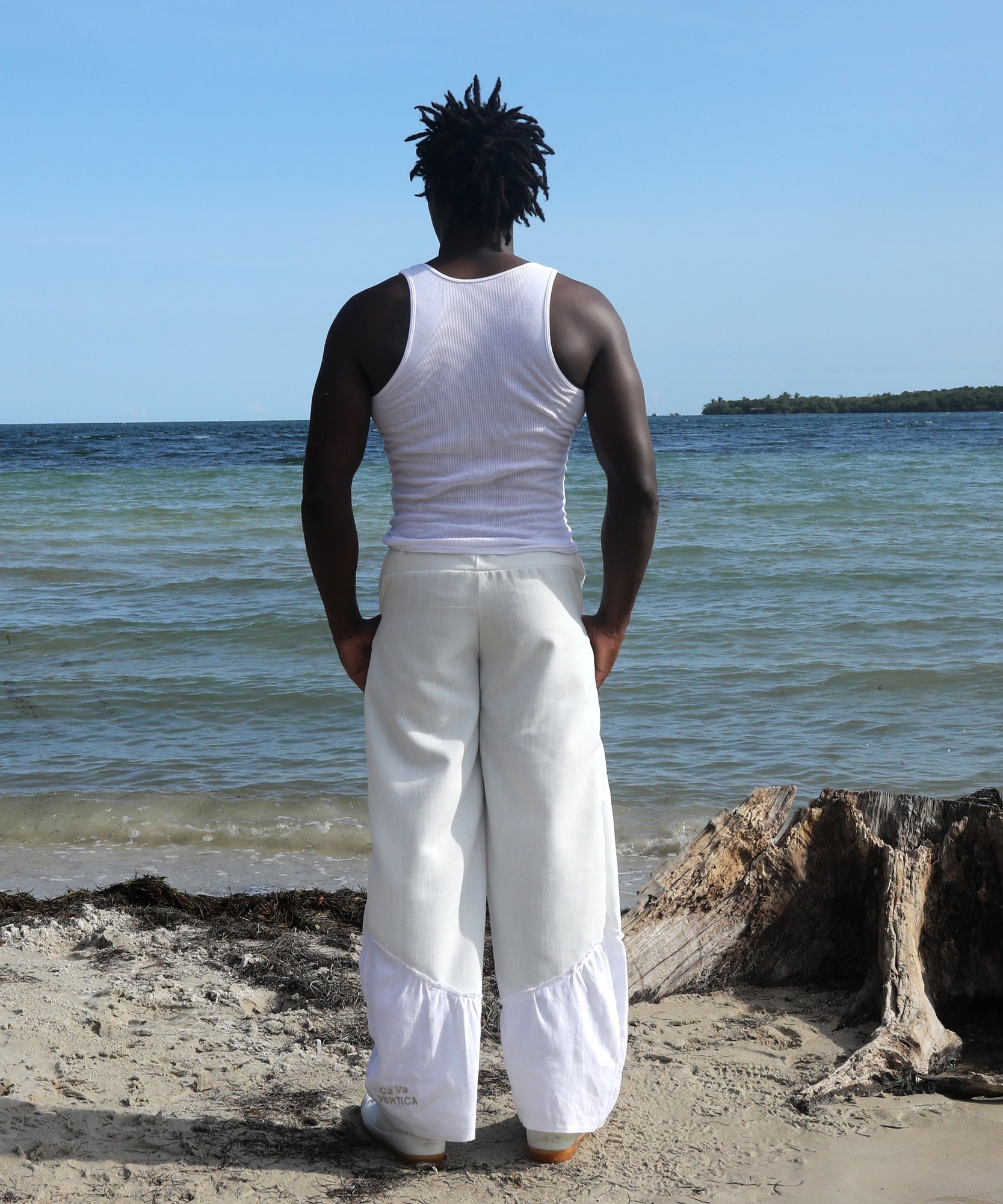 the base of these pants are made with a heavy weight linen fabric that is breathable and soft to the touch. panel detailing on the bottom of legs creates texture by introducing a lighter weight white linen. drawstring waistband allows you to adjust the fit to your liking.