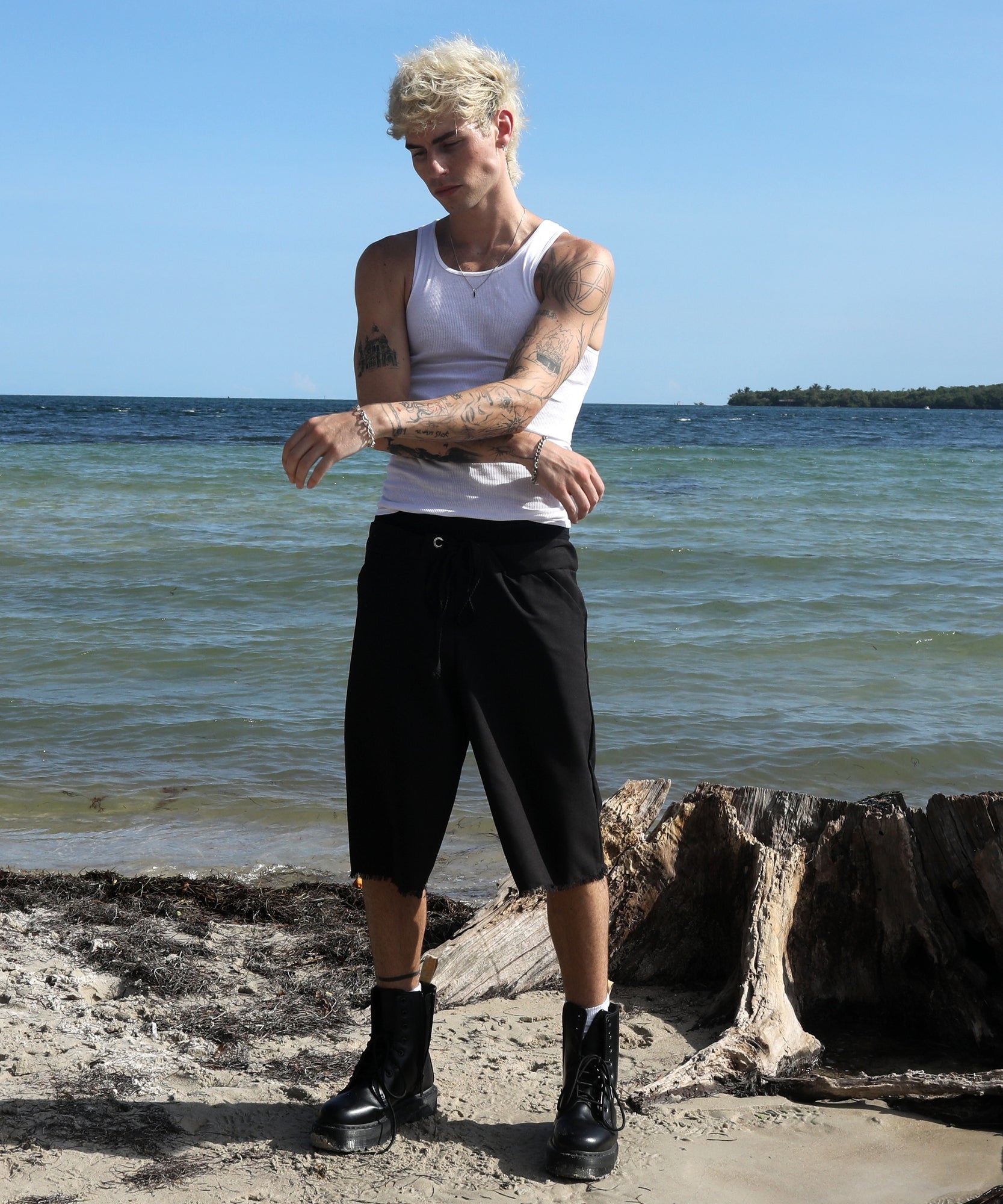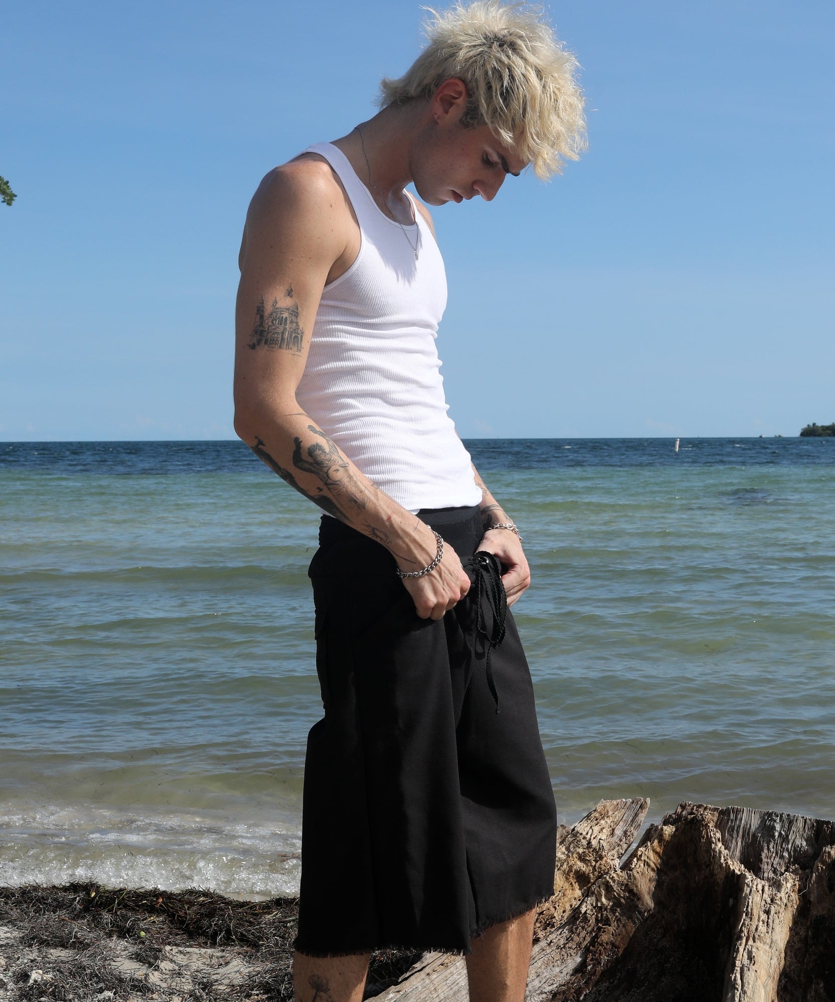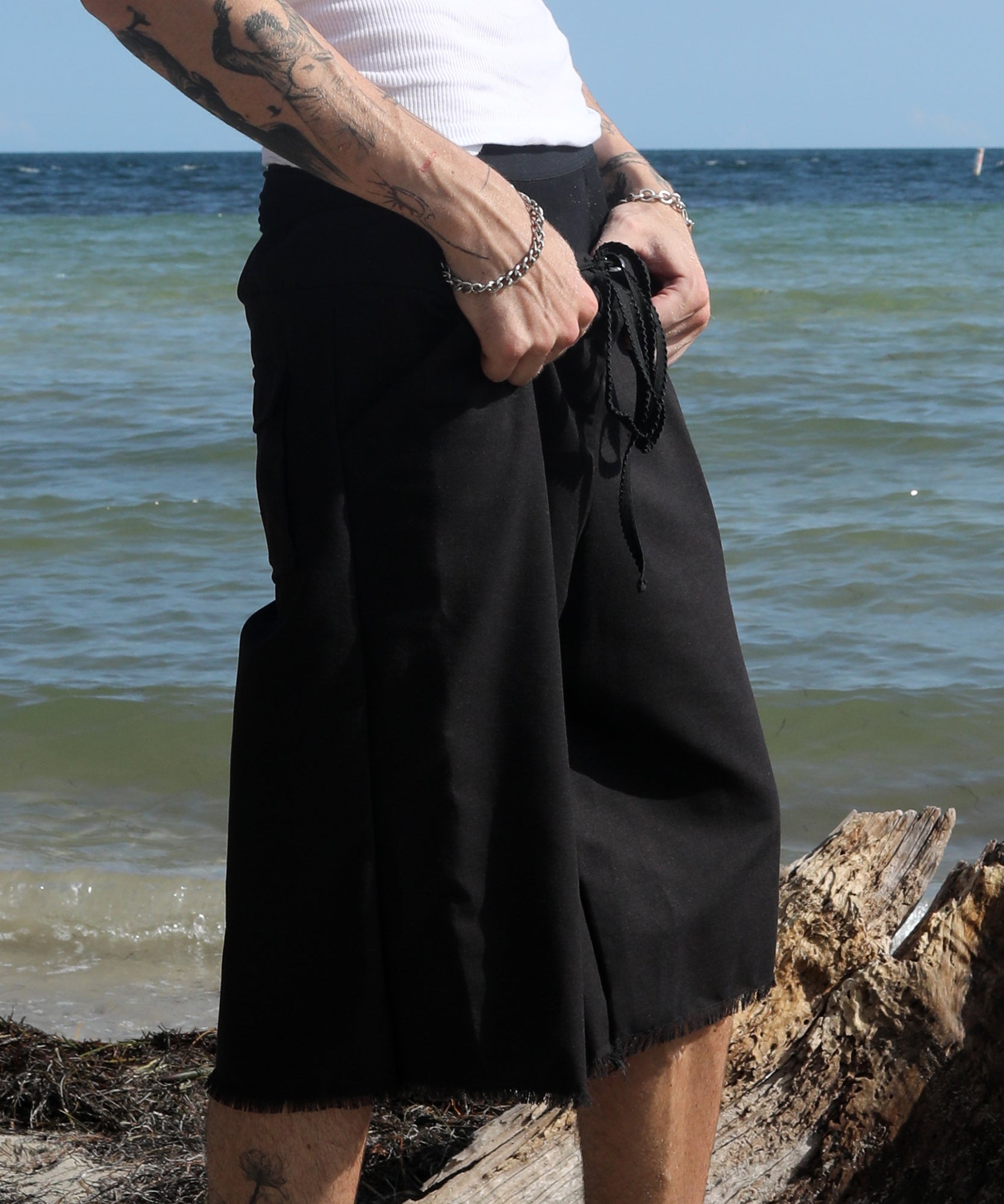 these shorts are made with a heavyweight linen fabric in deep black that is breathable and soft to the touch. deep internal pockets on front, external pockets on back. bottom hem is kept raw. drawstring waistband allows you to adjust the fit to your liking.