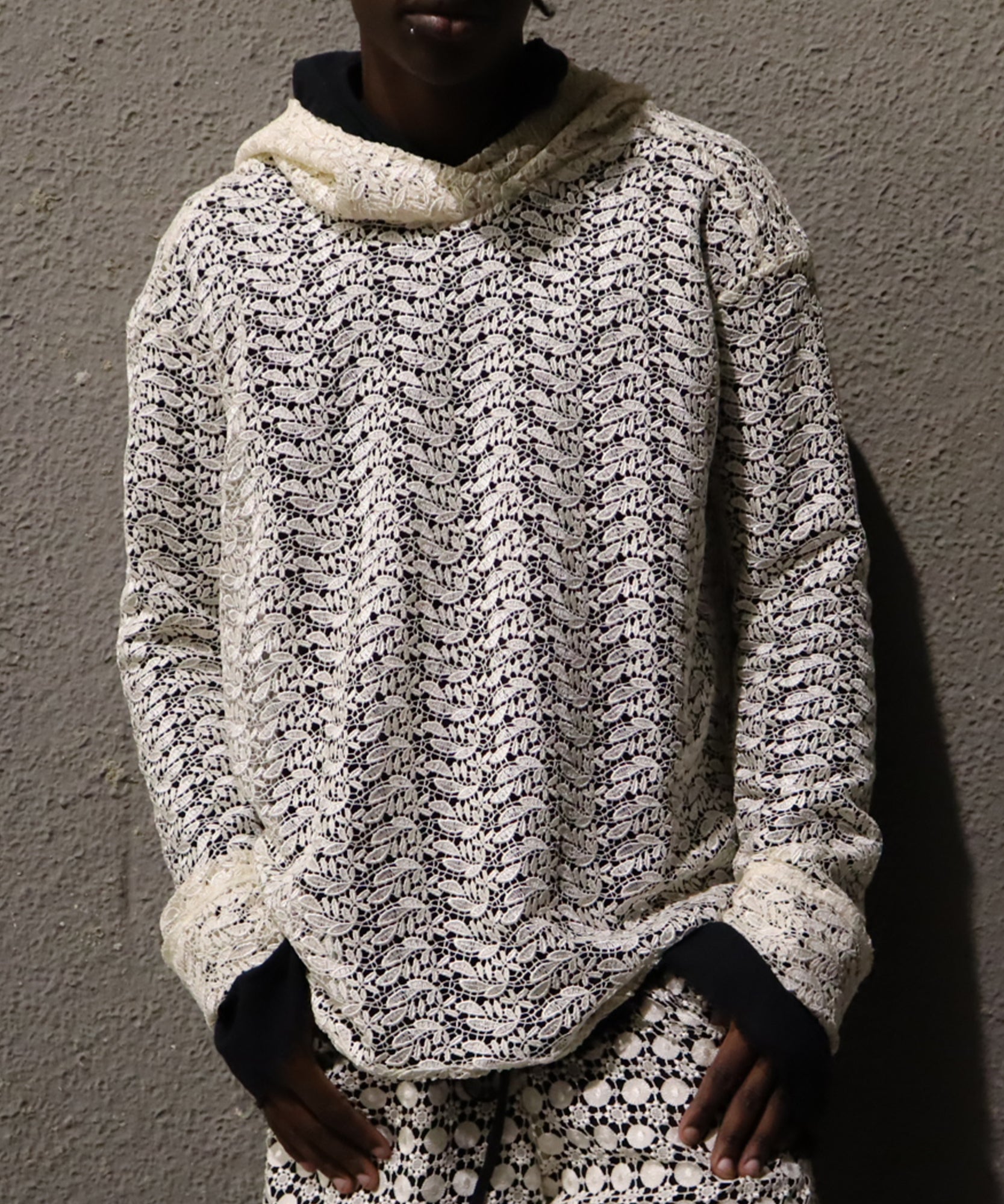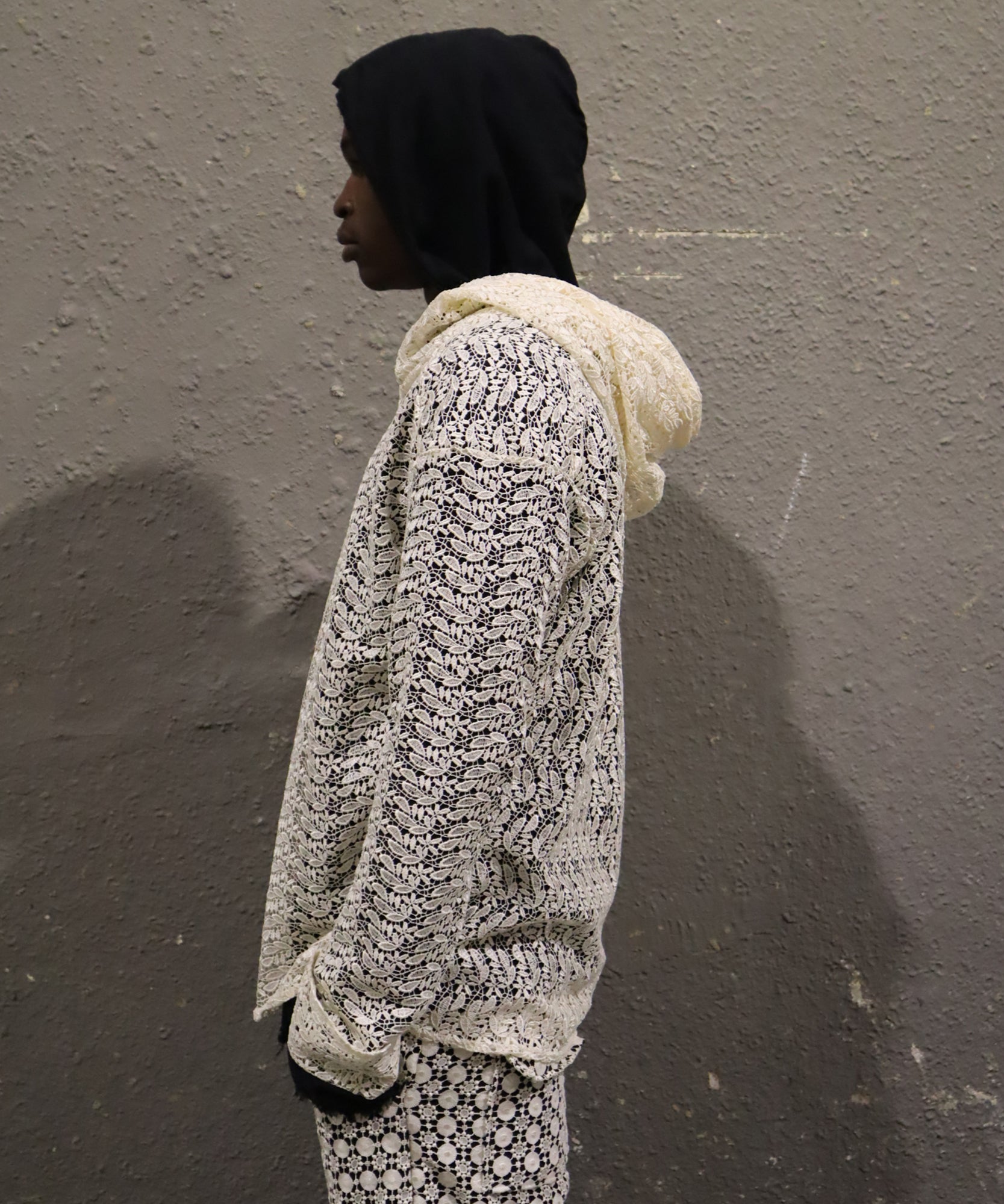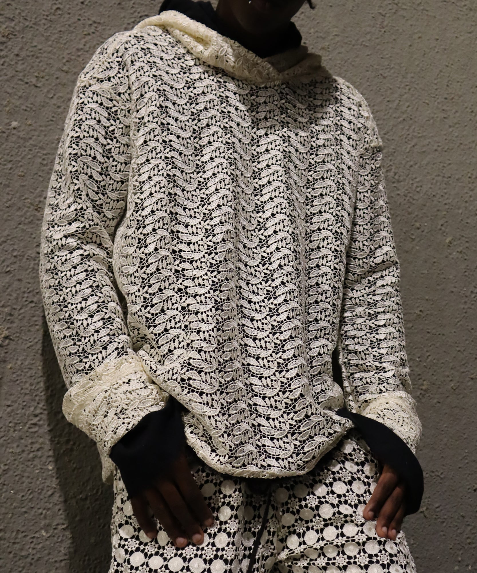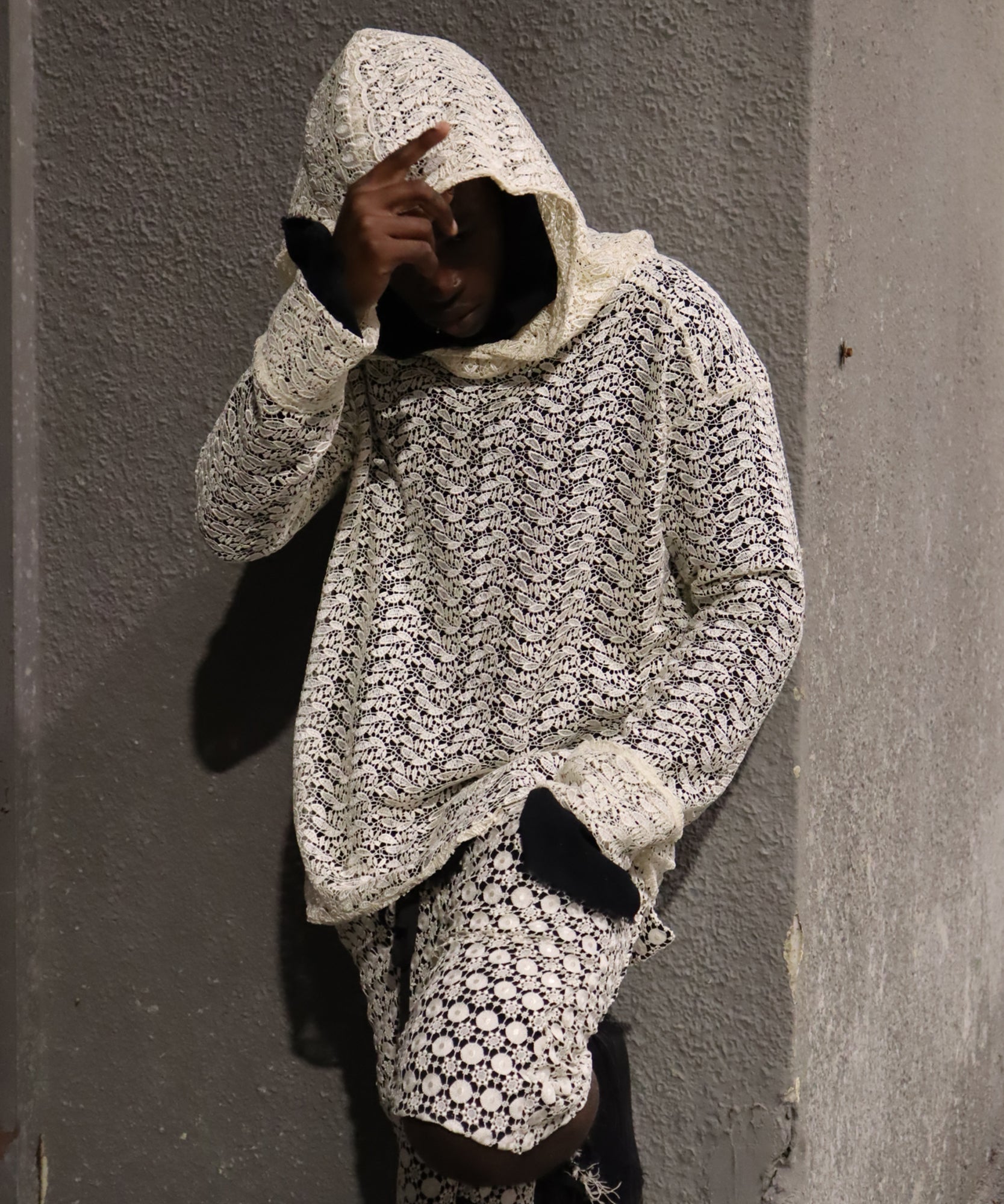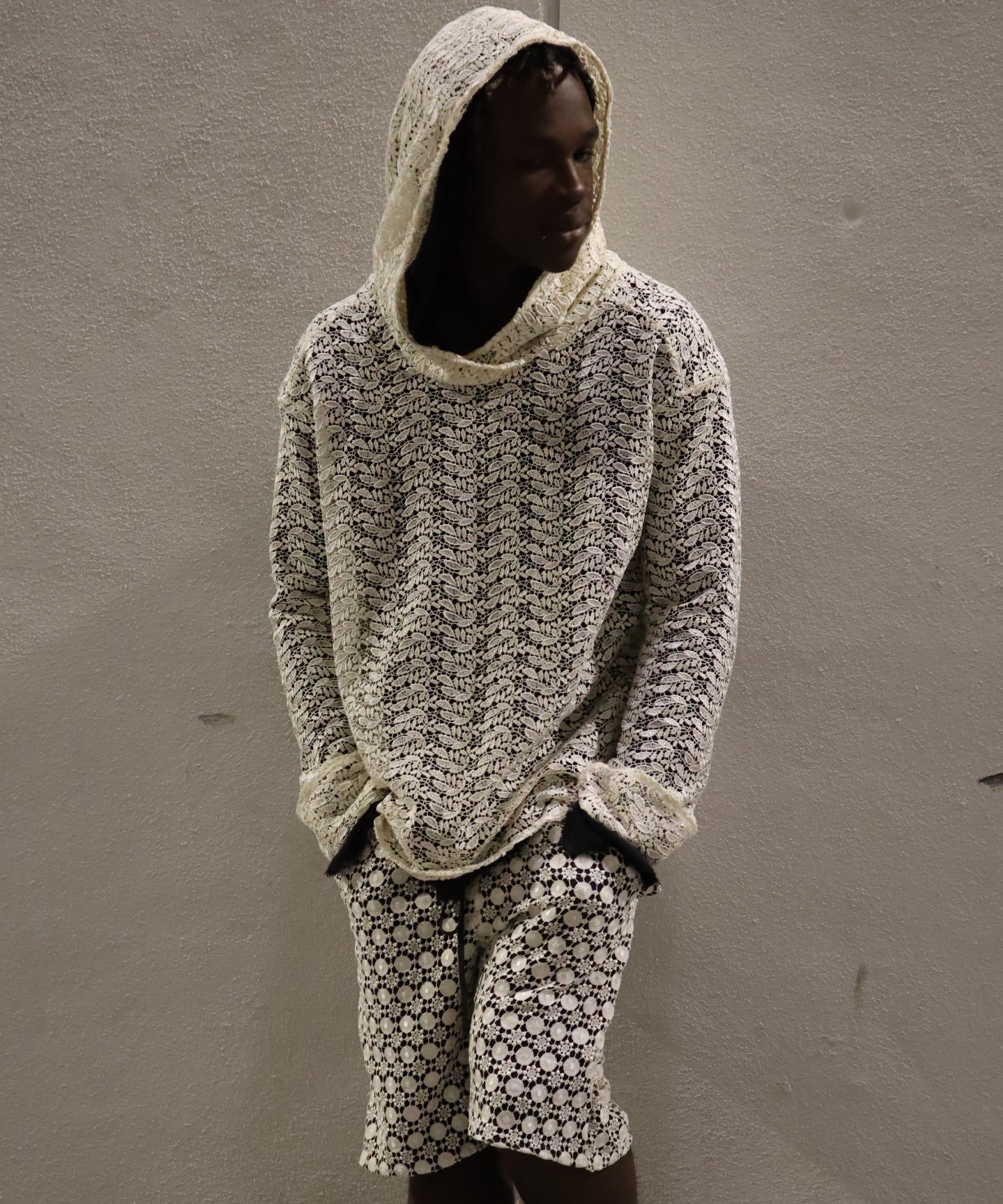 this piece is the lace hoodie only, it is photographed layered with hooded long sleeve in black and mesh shorts in black