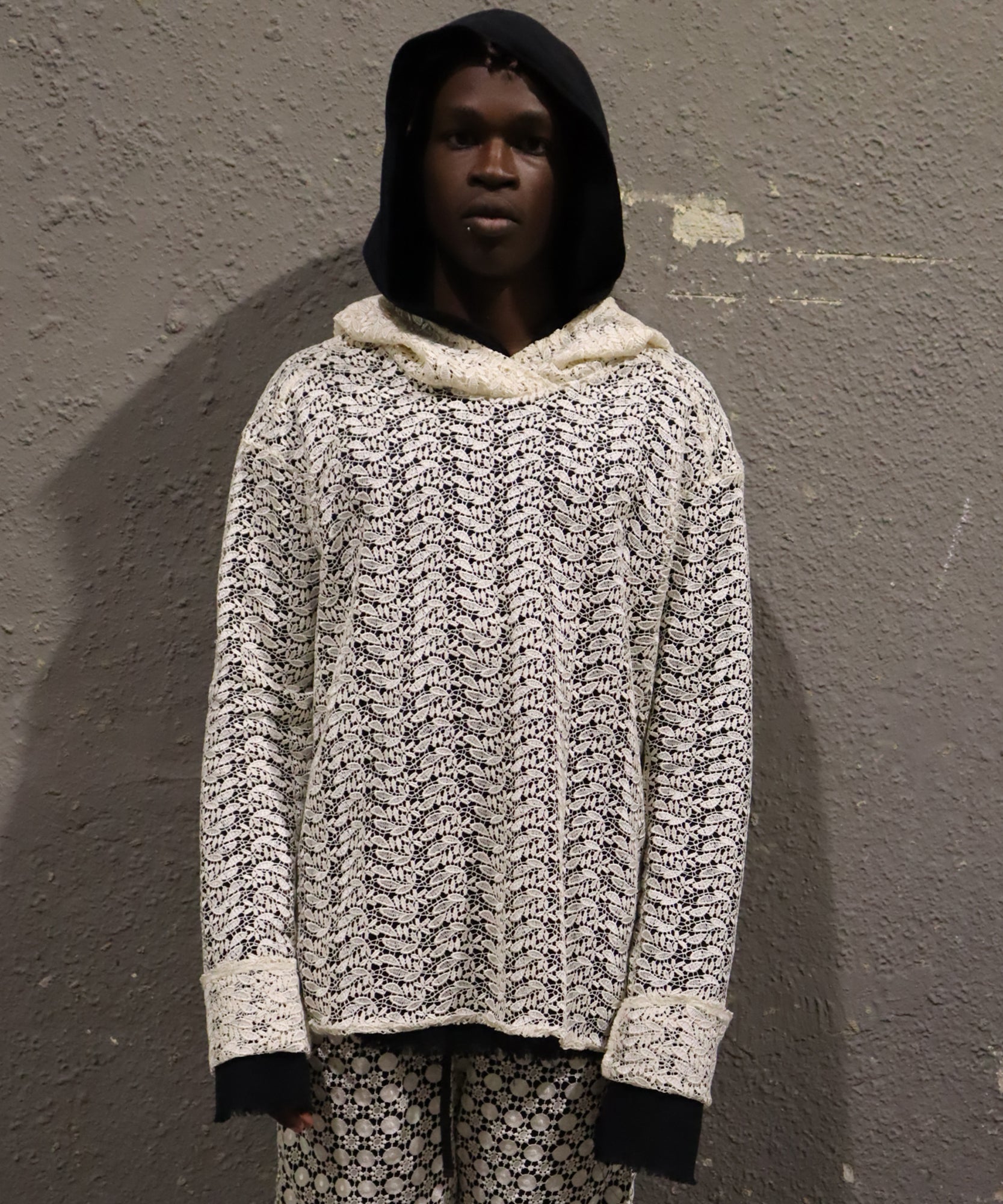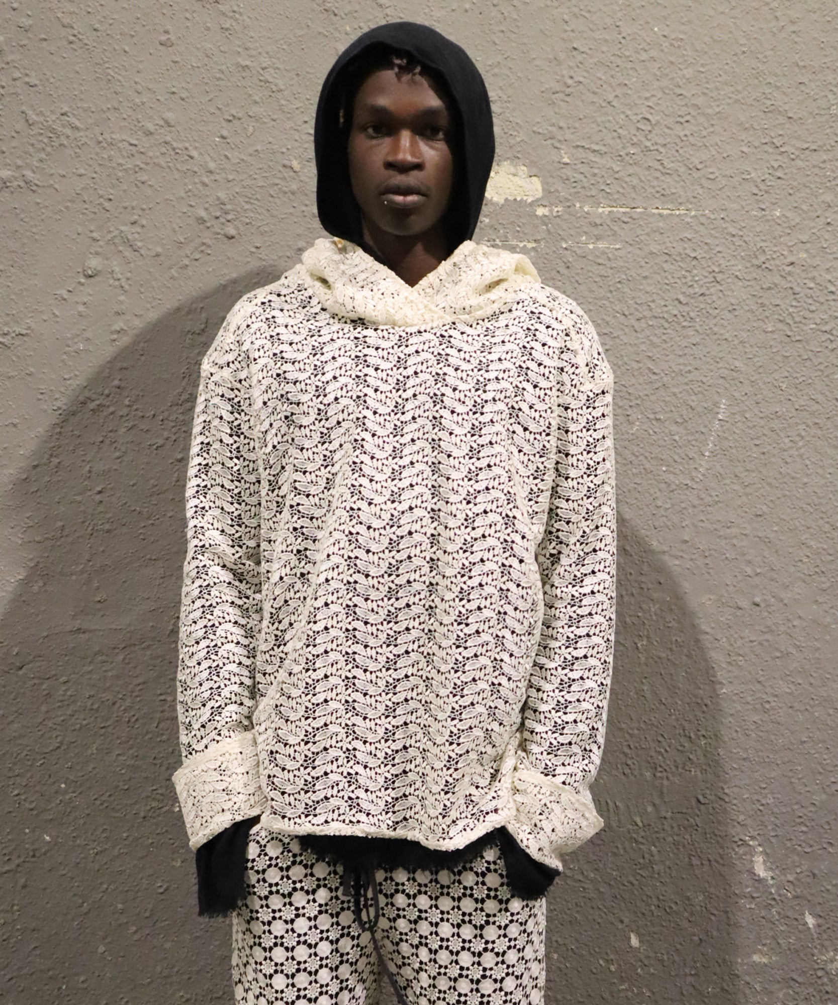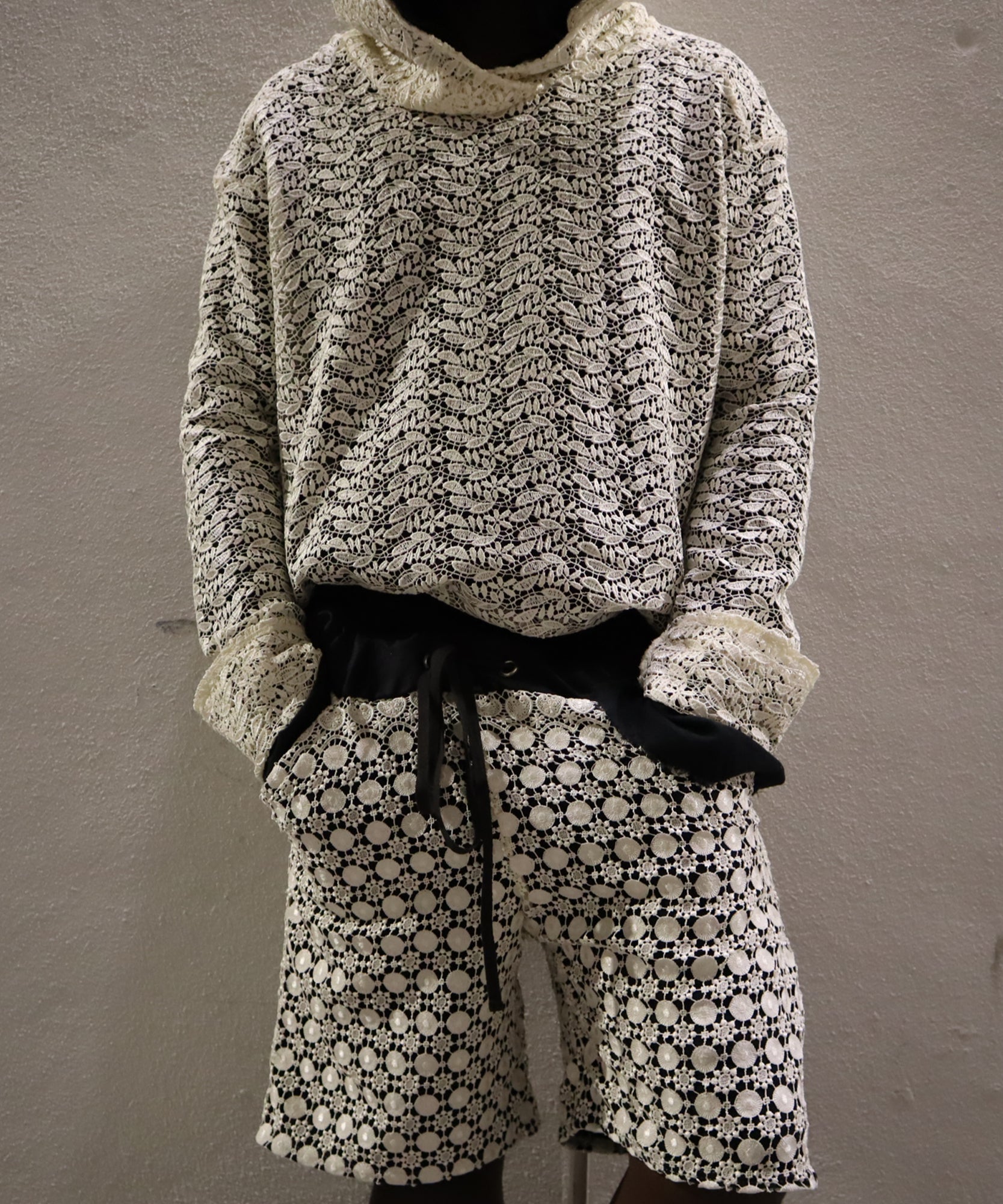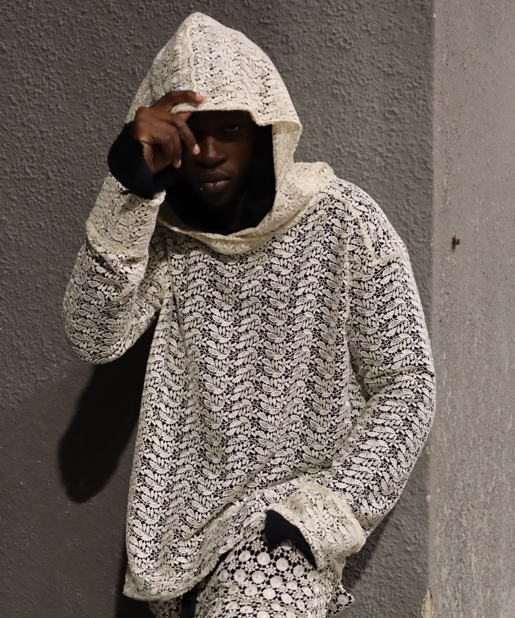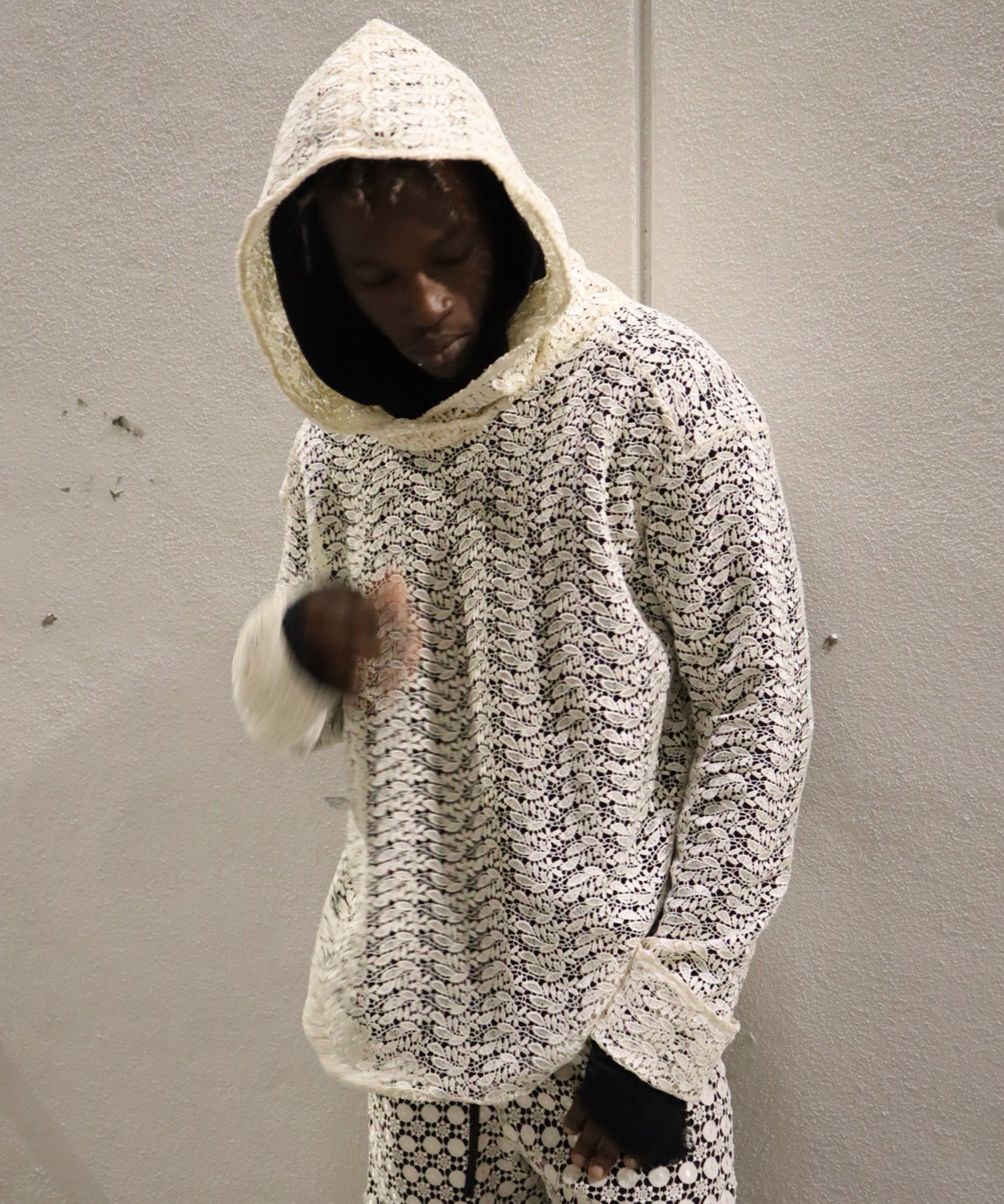 this piece is the lace hoodie only, it is photographed layered with hooded long sleeve in black and mesh shorts in black