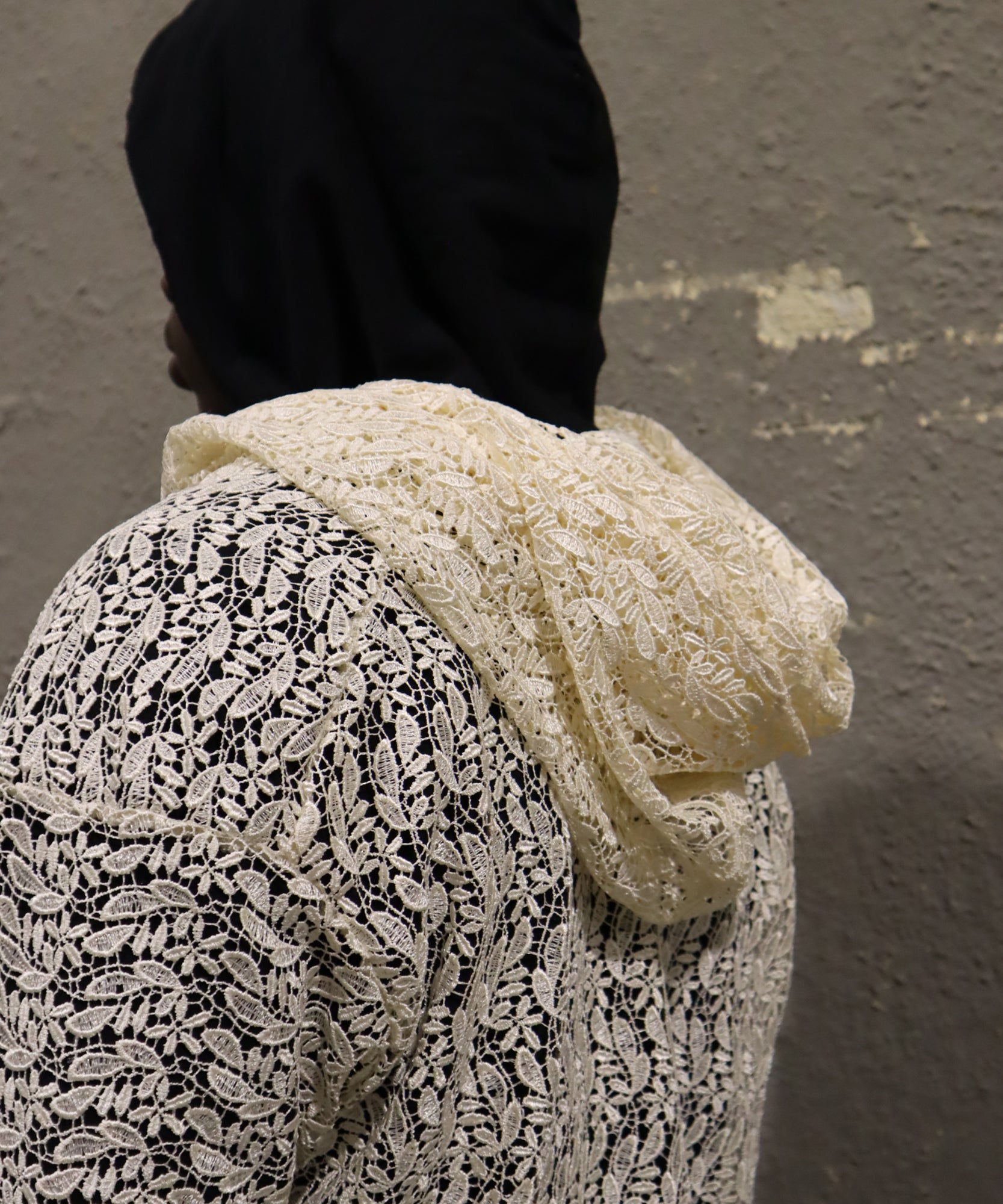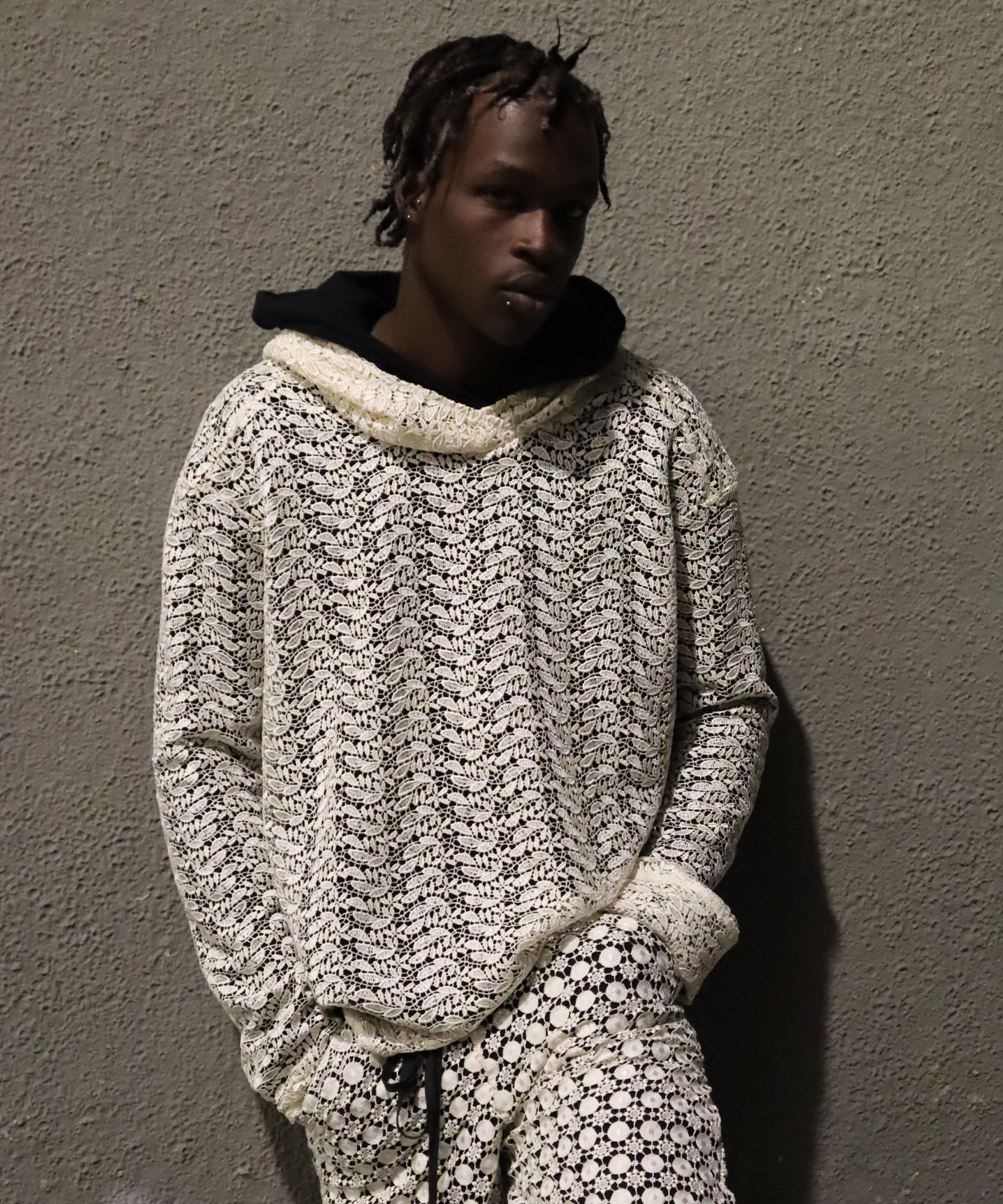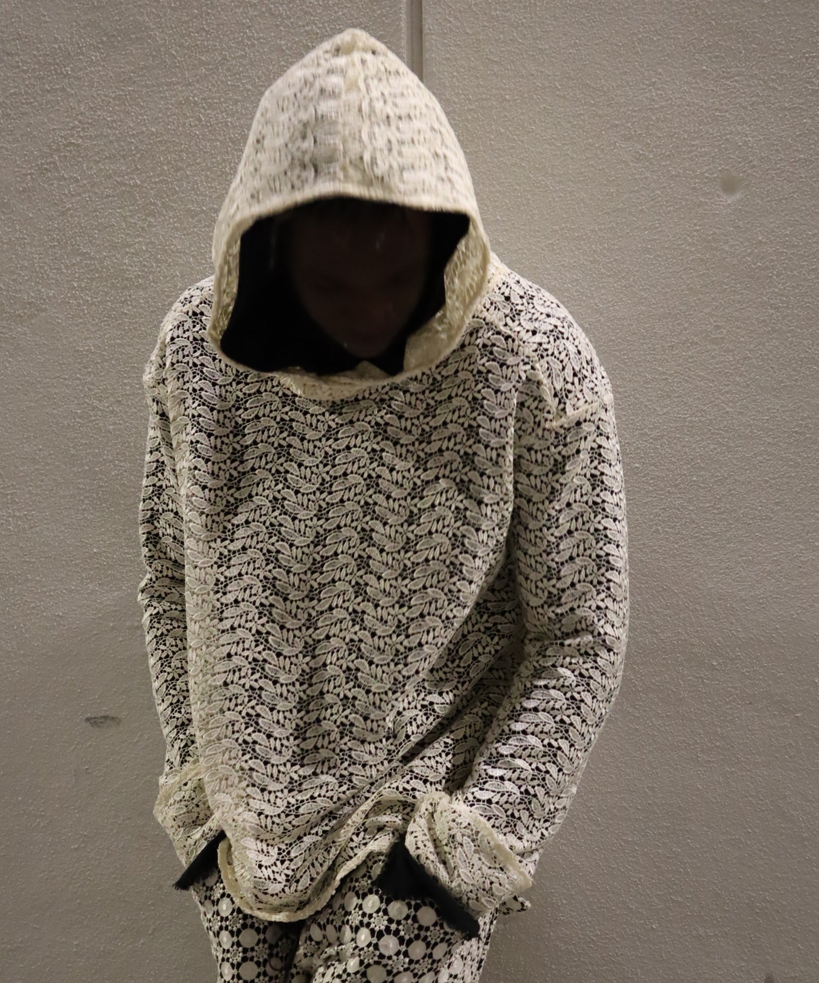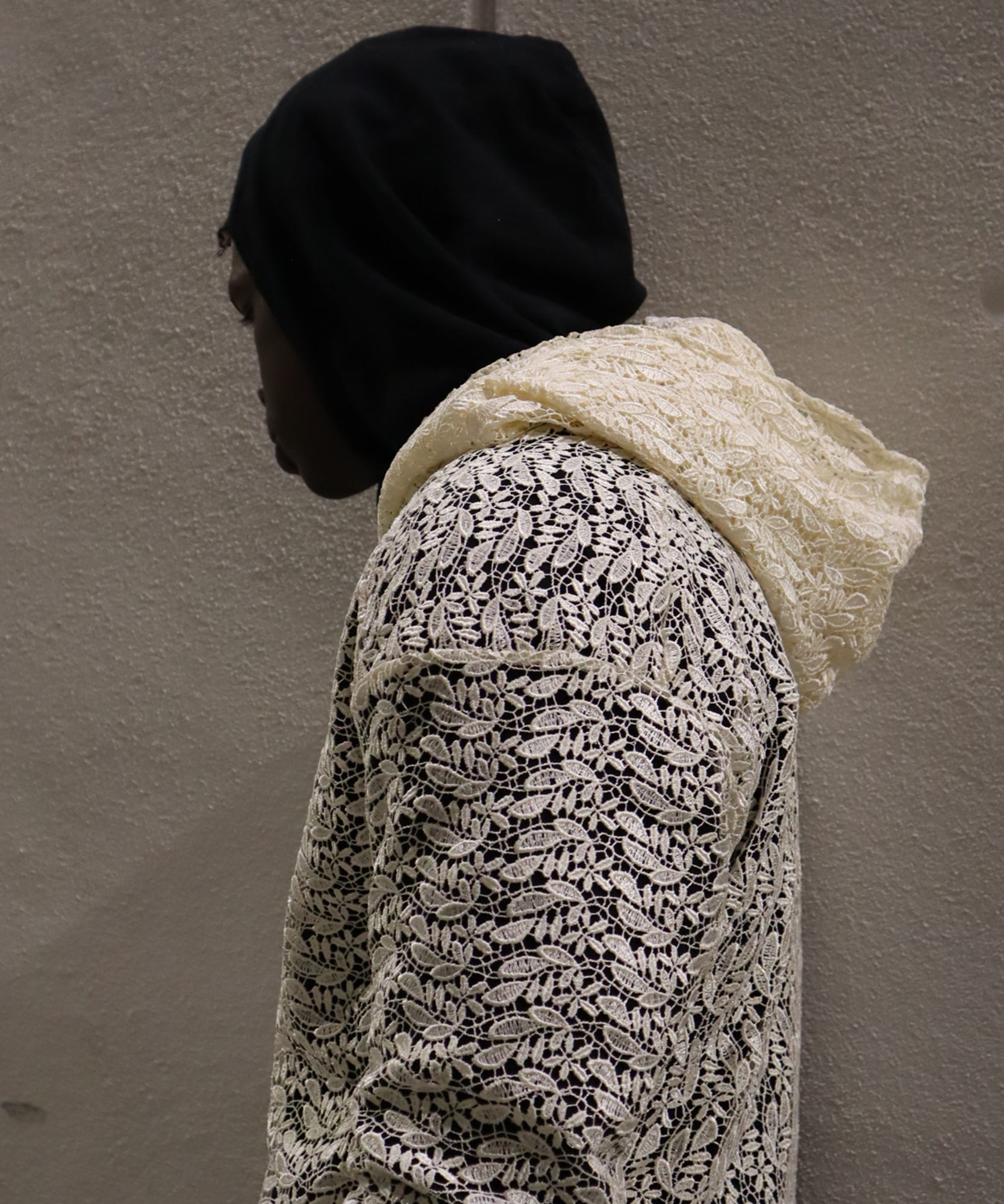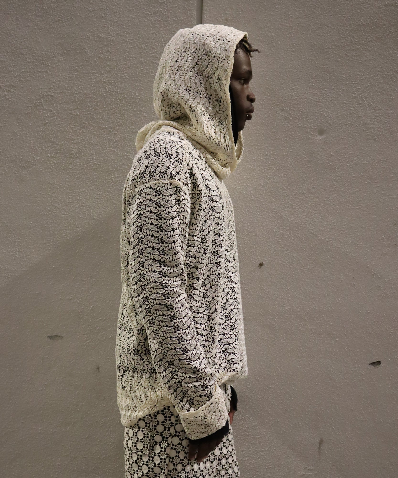 this piece is the lace hoodie only, it is photographed layered with hooded long sleeve in black and mesh shorts in black