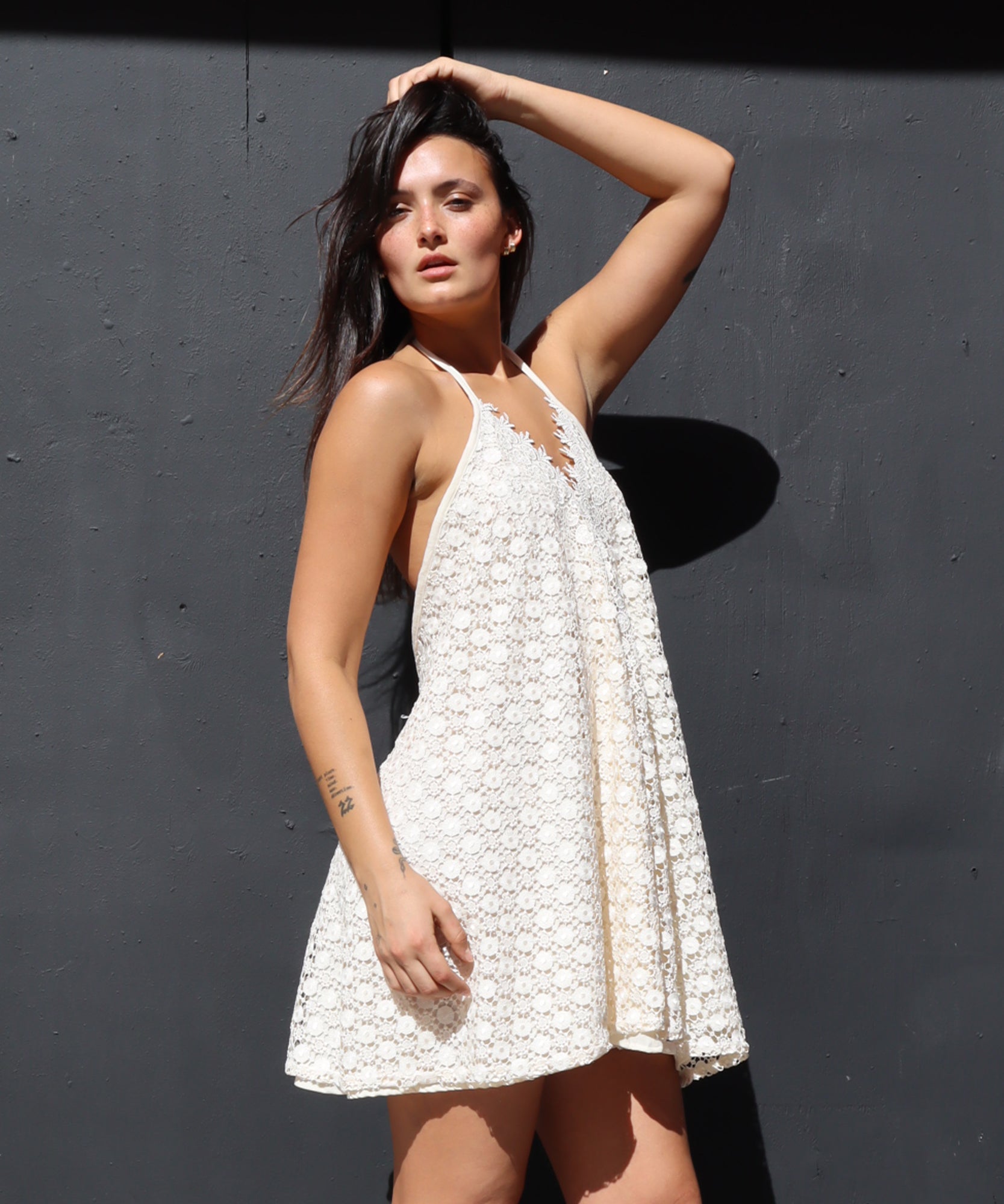 double layered mini dress with open back in cream