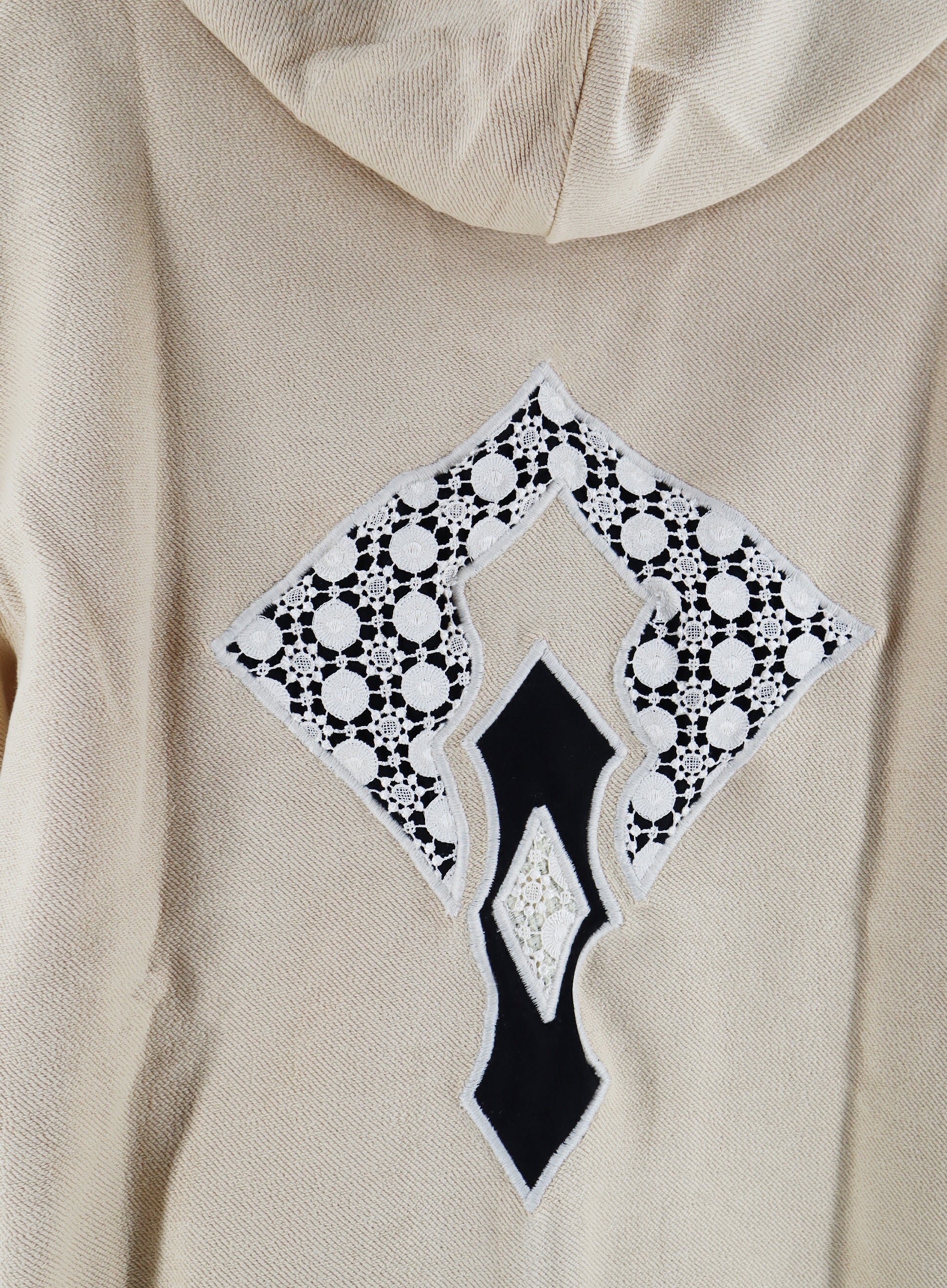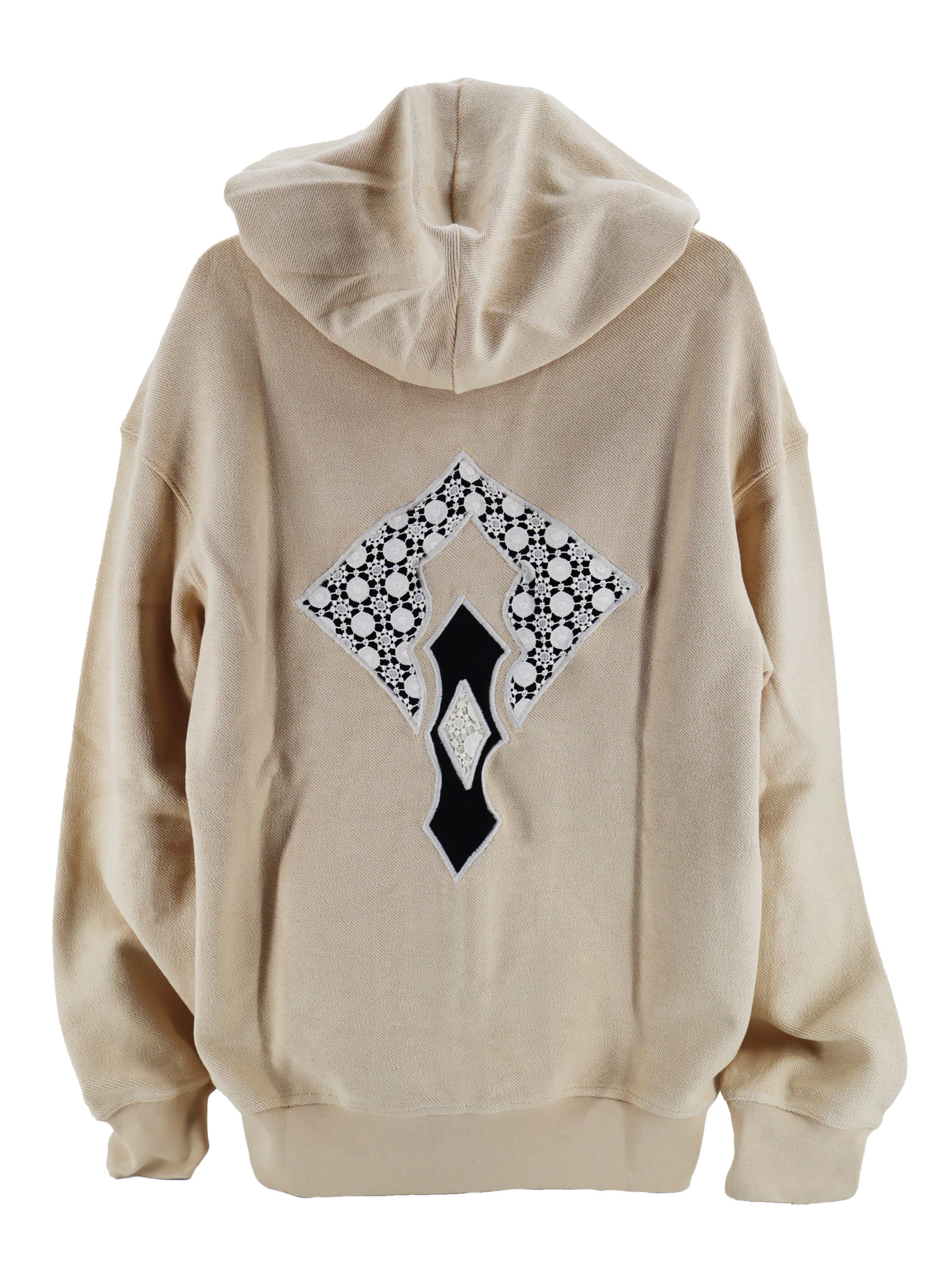 the Shield Hoodies were inspired by medieval shields and other iconography from some of our favorite movies and video games. we wanted to find a way to repurpose fabric scraps from previous collections this year, as well as reimagine our “Natural Zip” hoodie in a way that felt authentic to us. each design is equipped with a special shield that will protect you when you wear it; we hope you can feel the good energy of this hoodie.