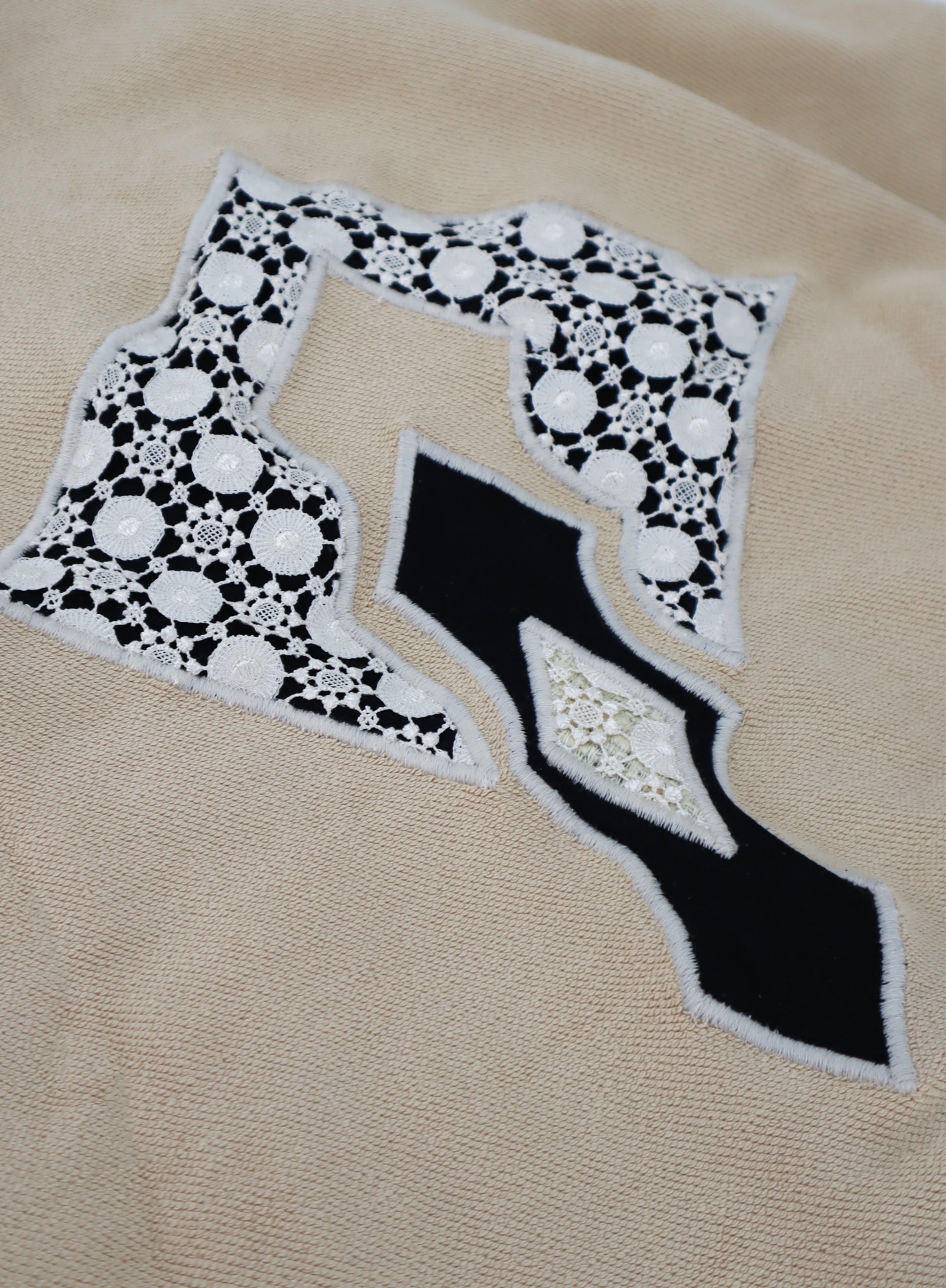 ✧ hand sewn shield decal constructed with black linen and eyelet lace