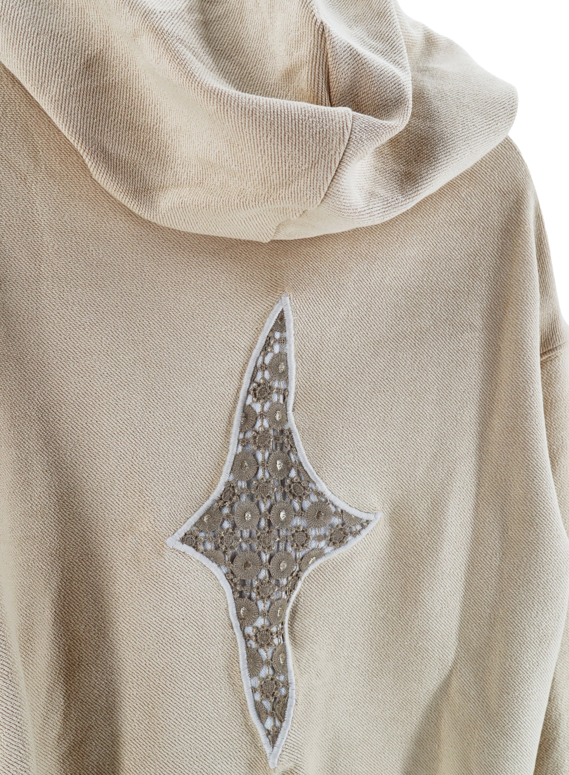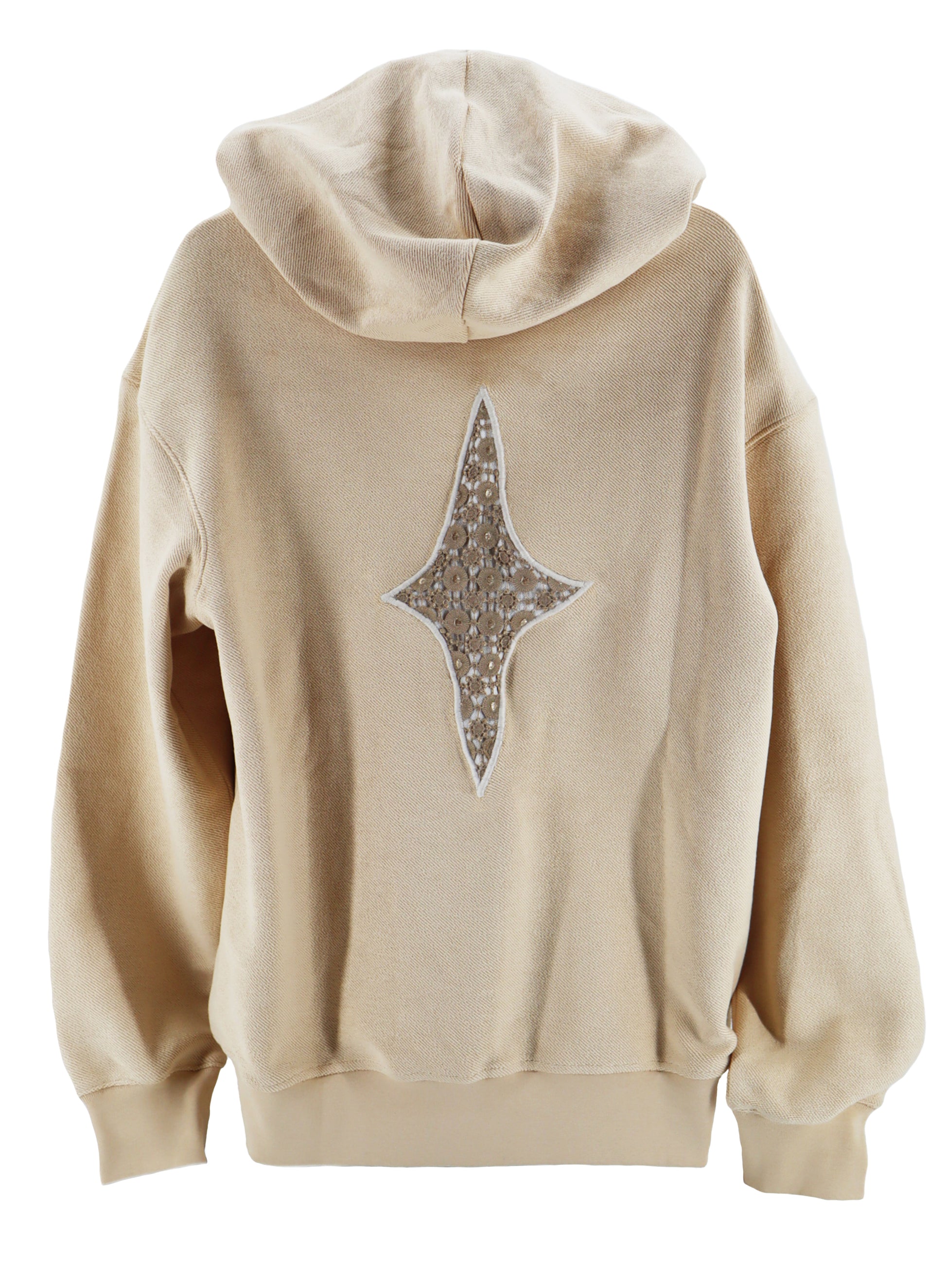 the Shield Hoodies were inspired by medieval shields and other iconography from some of our favorite movies and video games. we wanted to find a way to repurpose fabric scraps from previous collections this year, as well as reimagine our “Natural Zip” hoodie in a way that felt authentic to us. each design is equipped with a special shield that will protect you when you wear it; we hope you can feel the good energy of this hoodie.